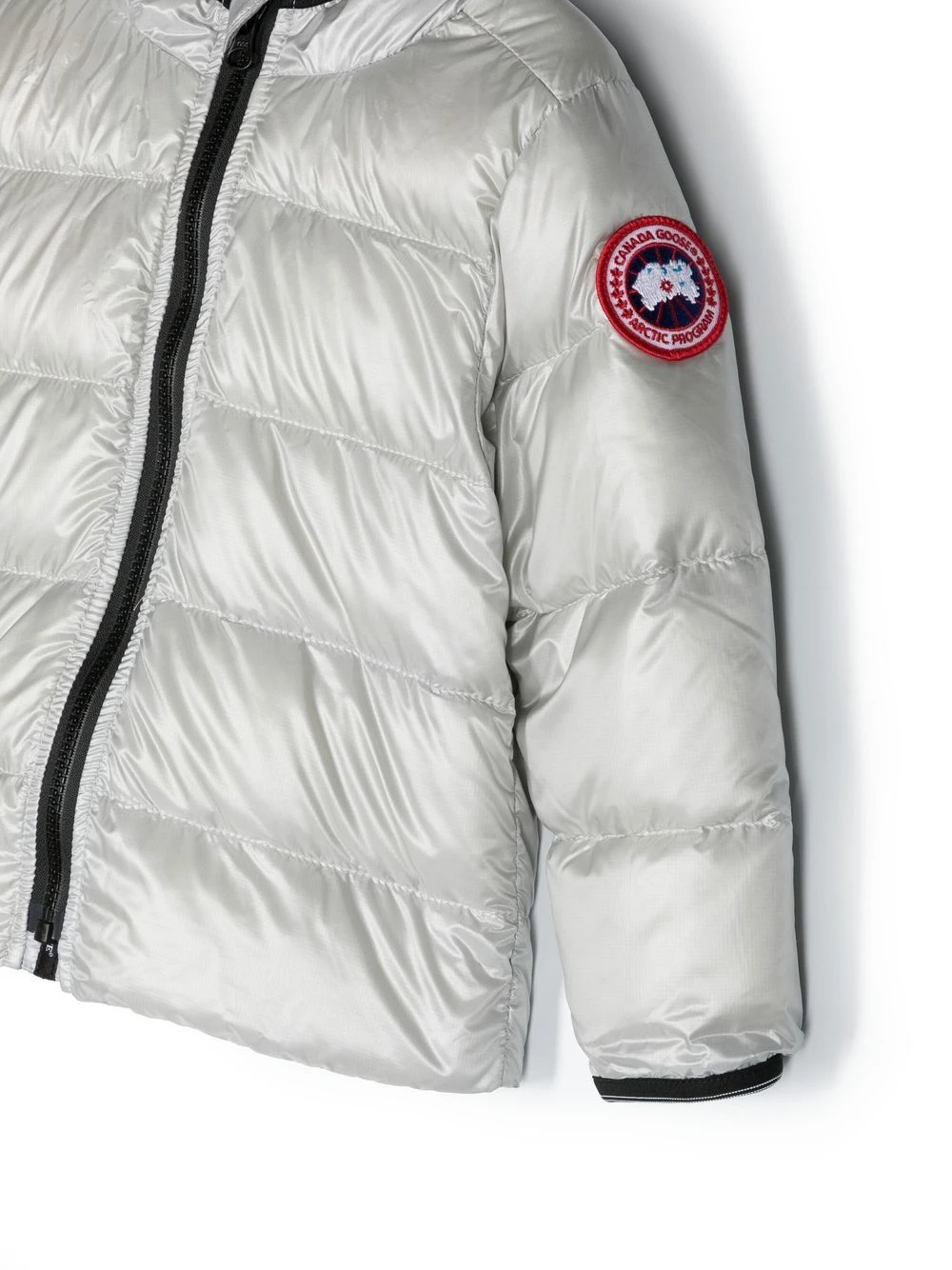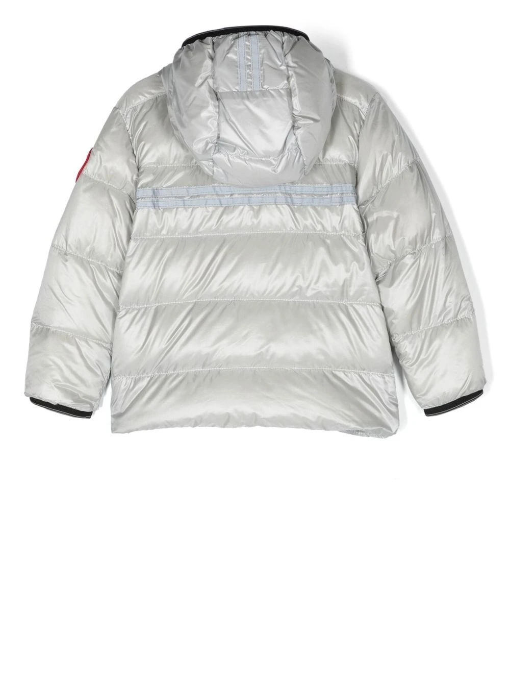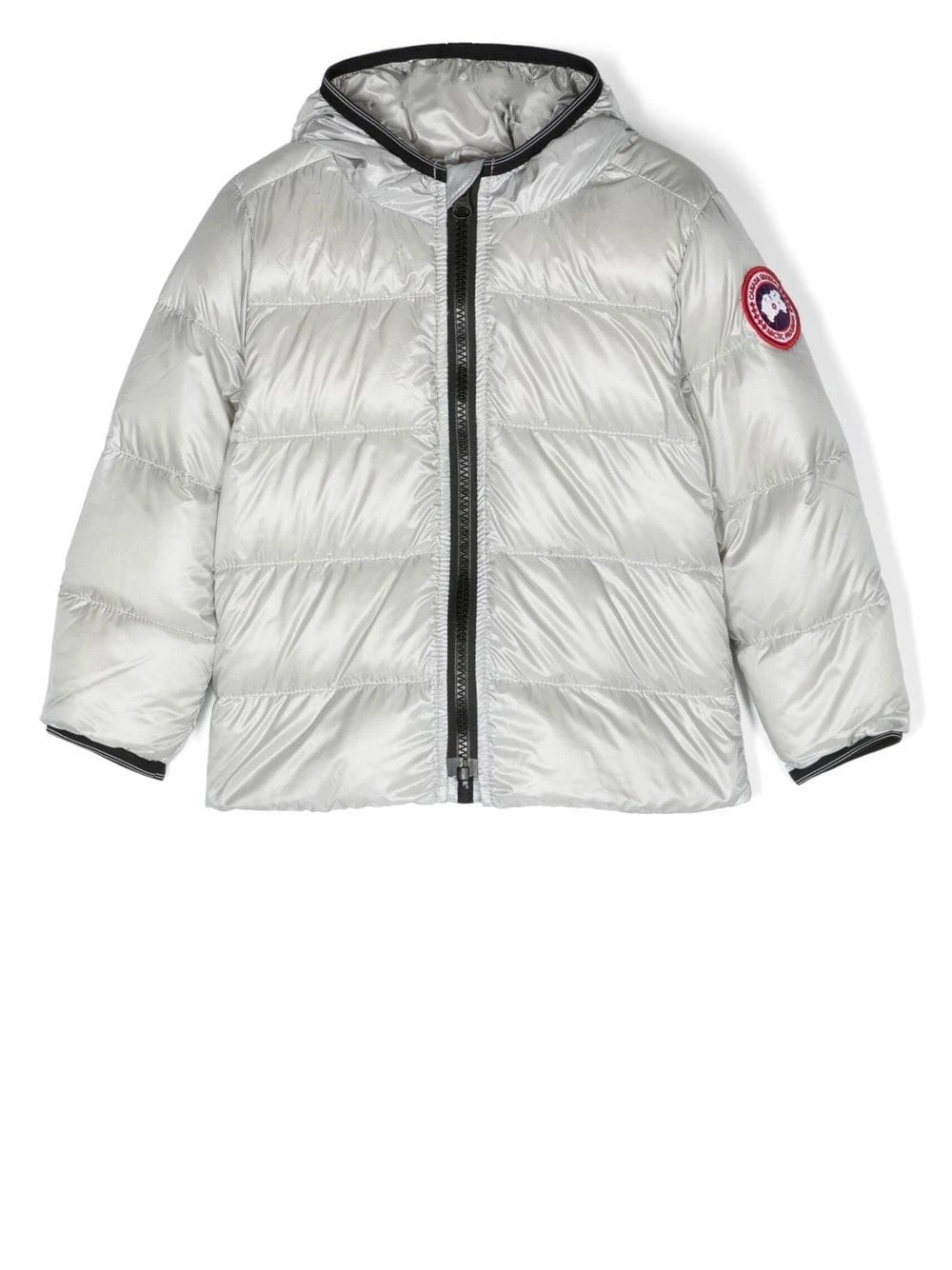 Sølvfarvet, genanvendt polyamid, polstret design, metallisk finish, quiltet, logomærke på ærmet, lynlåslukning foran, klassisk hætte. ANSVARSBEVIDST: Denne vare er fremstillet af mindst 50% genanvendte materialer. For beklædningsgenstande i genanvendte syntetiske materialer anbefaler vi kraftigt, at der anvendes en vaskepose, som fanger mikroplast, for at undgå forurening af vandet i processen..