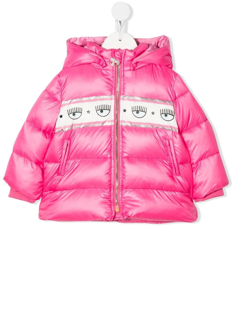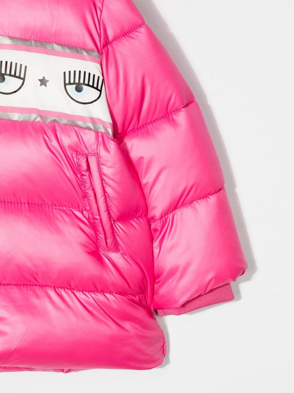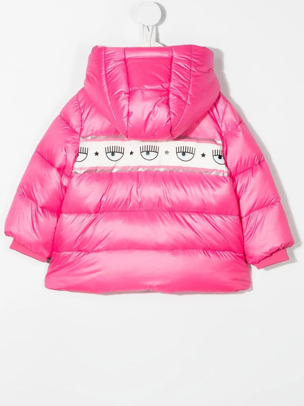 Fuchsia, logo-detalje, polstret design, klassisk hætte, lynlåslukning foran, lange ærmer, to sidelommer med kantbånd.