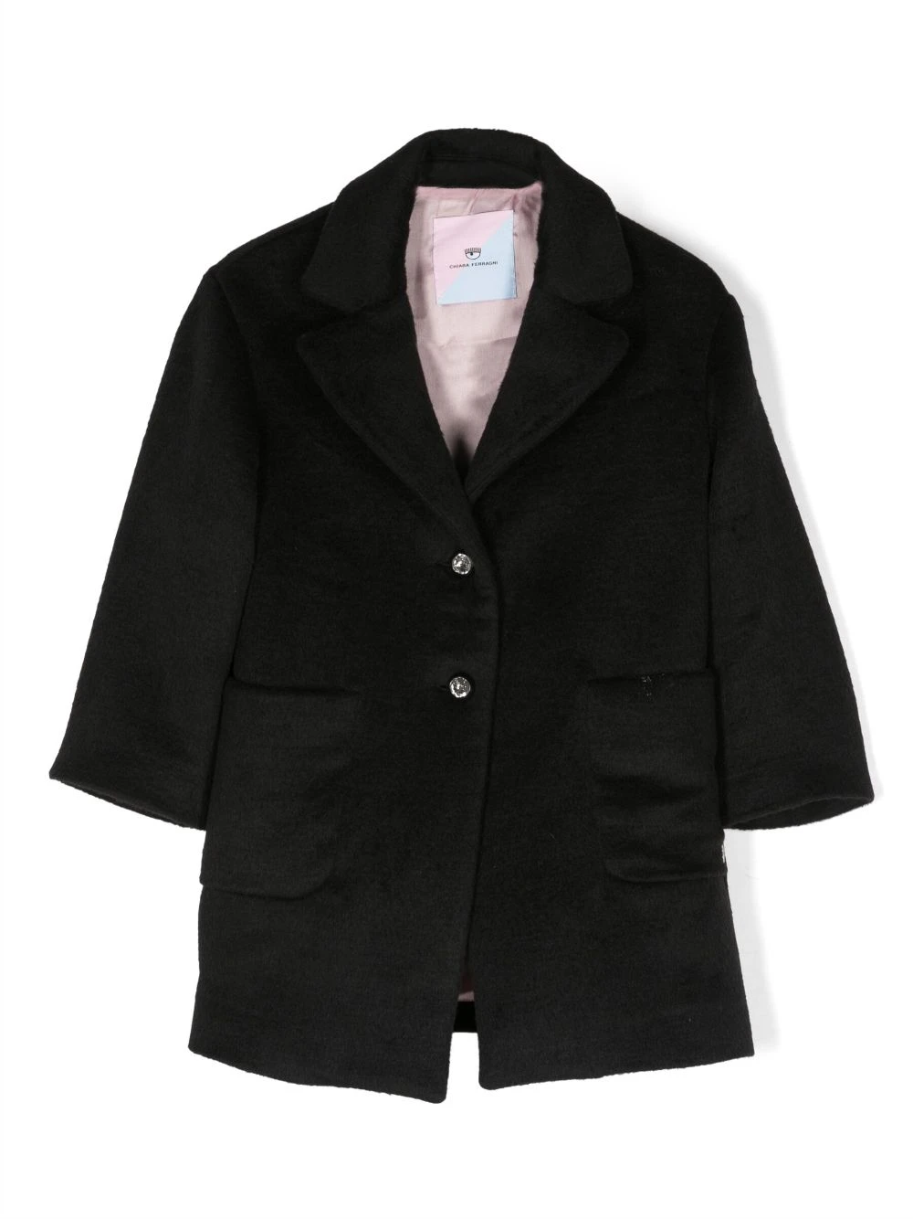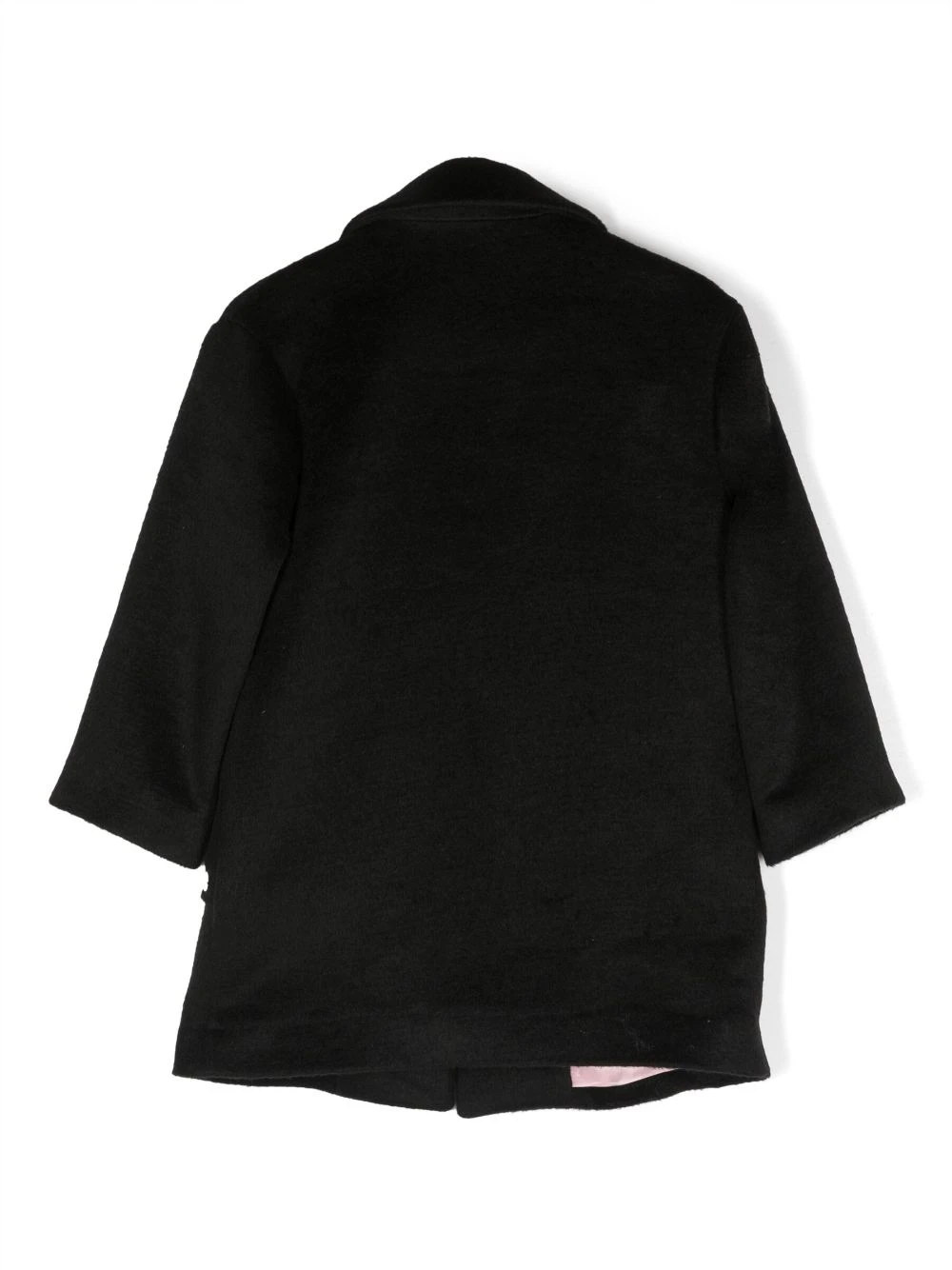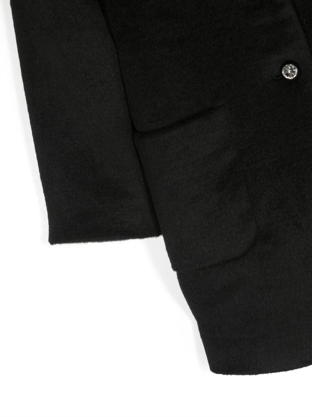 Sort, hakreverser, knaplukning foran, krystaludsmykkede knapper, to påsyede lommer foran, knaplukning foran, lange ærmer, lige søm, mid-længde.