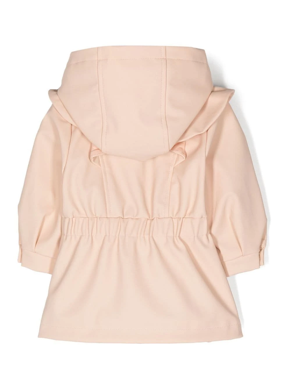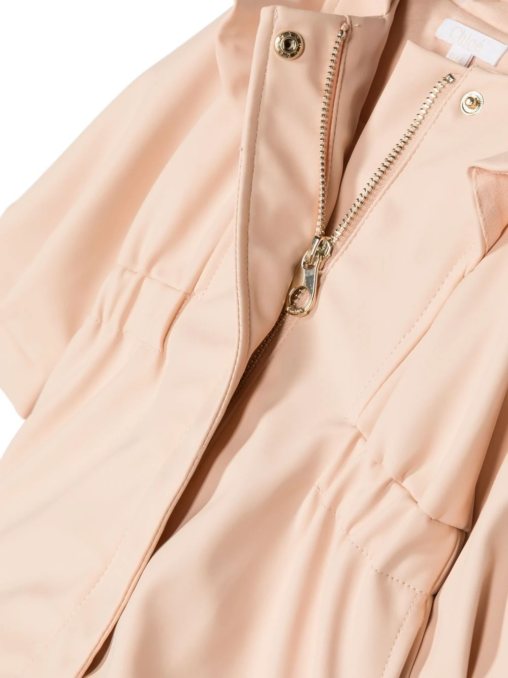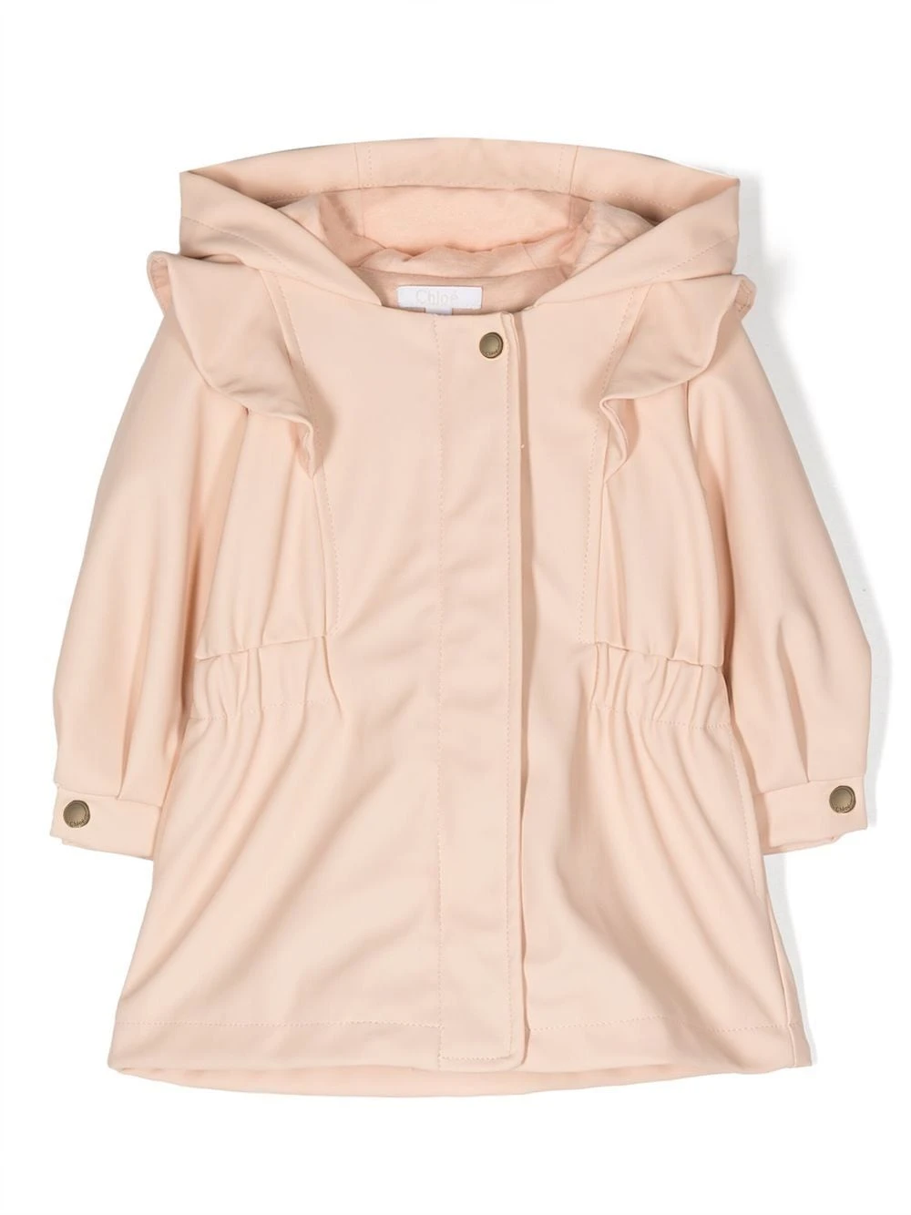 Flæsedetalje, elastikkant, trykknap og lynlåslukning foran, klassisk hætte, lange ærmer, opslag med trykknaplukning, lige søm.