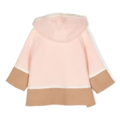 Pudderlyserød, vandafvisende finish, guldtonede knapper, klassisk hætte, skjult lynlåslukning foran, lange ærmer, to flaplommer foran, lige søm.
