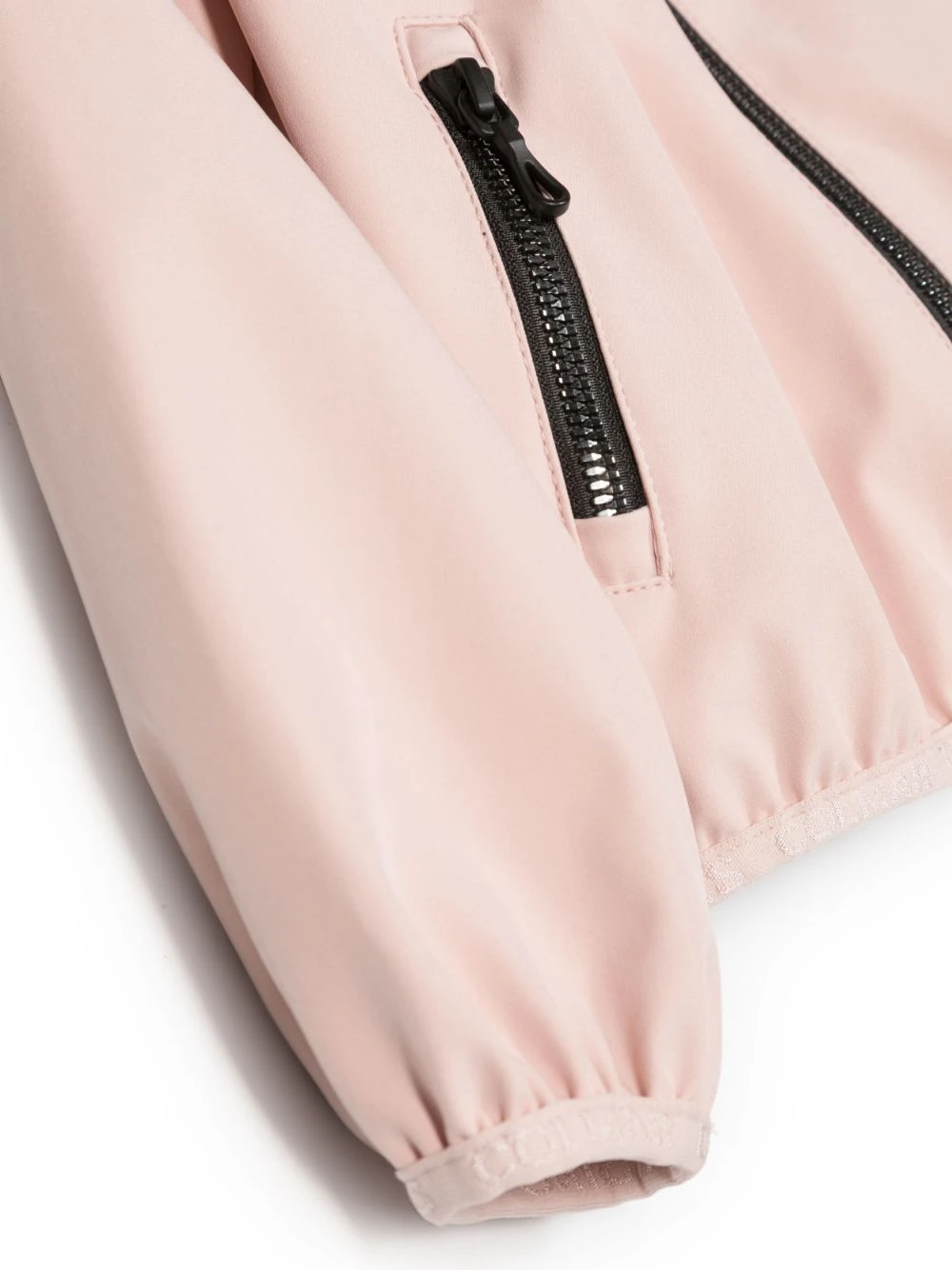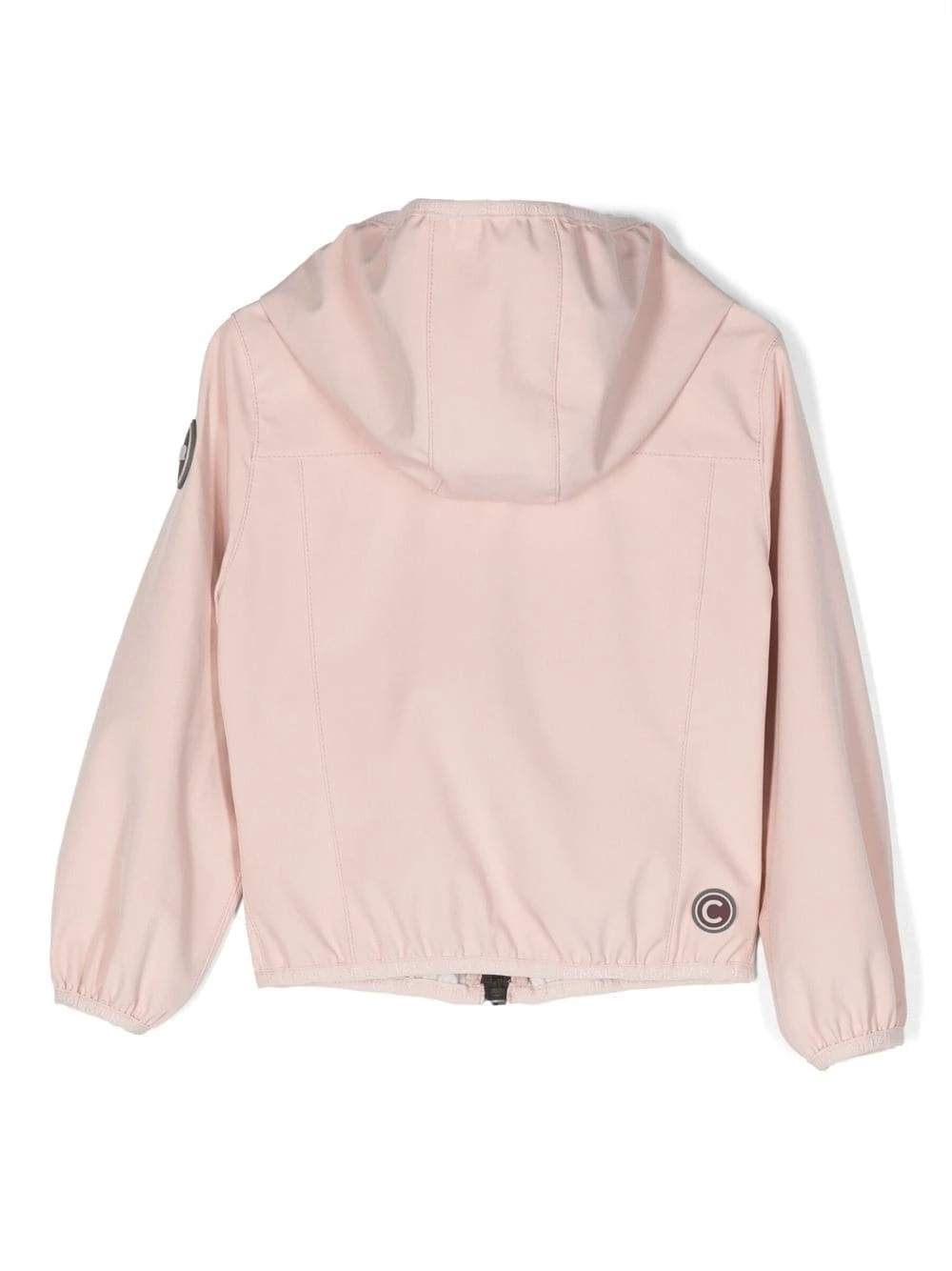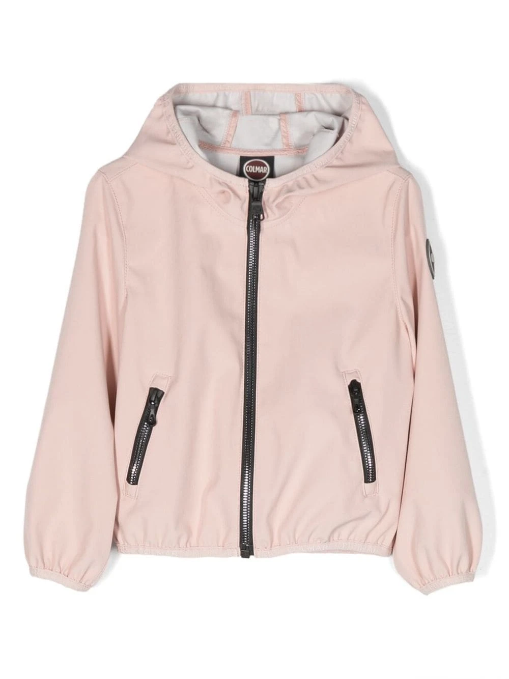 Pudderlyserød, strækbart design, klassisk hætte, logomærke på ærmet, logomærke bagpå, lynlåslukning foran, to lommer med lynlåslukning, lange ærmer, elastikopslag, lige søm.