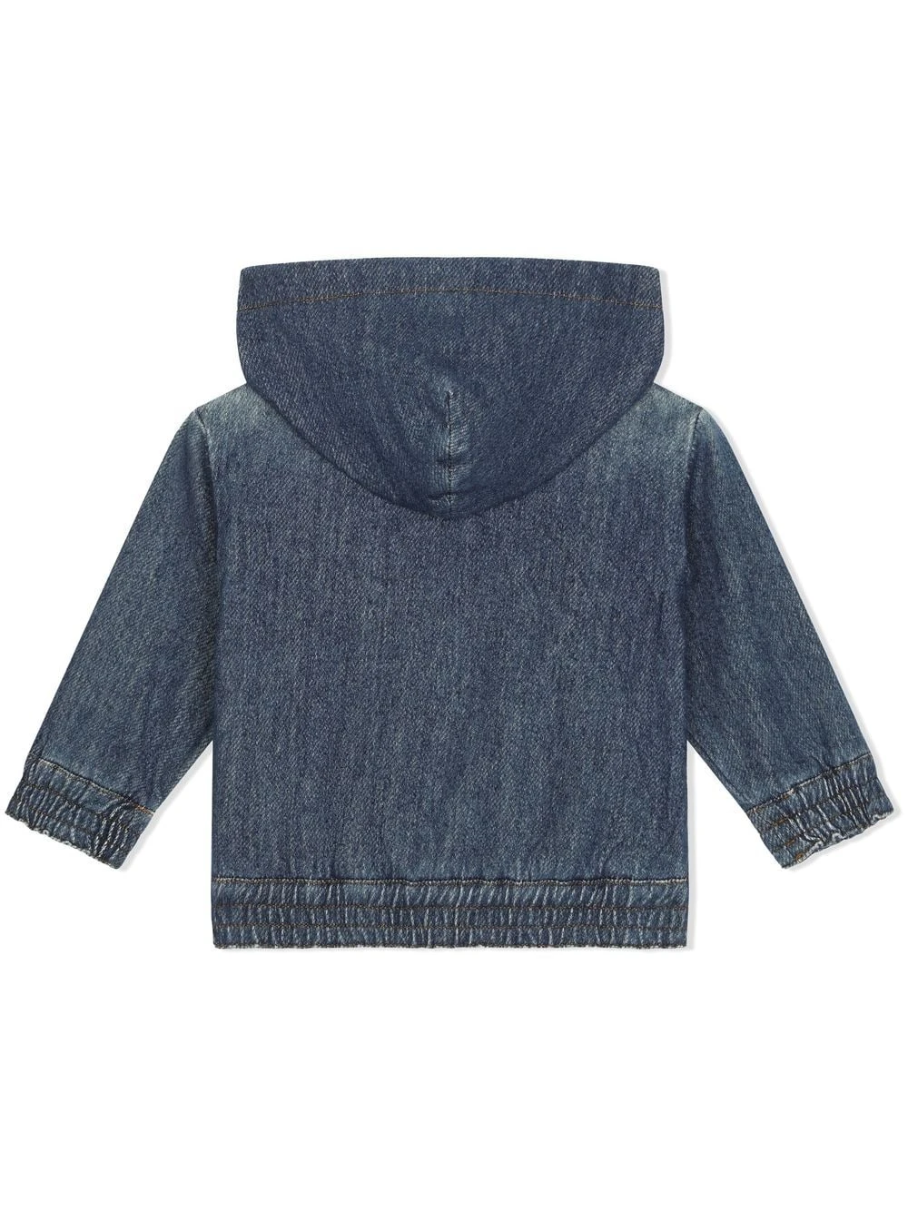 Blå, bomuldsblanding, denim, broderet logo på brystet, klassisk hætte, lange ærmer, lynlåslukning foran, to lommer i siden, elastisk detalje.
