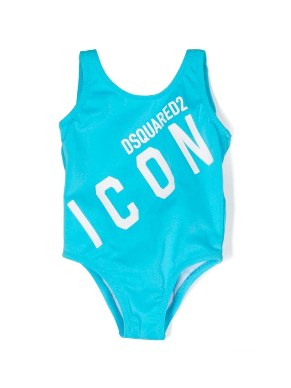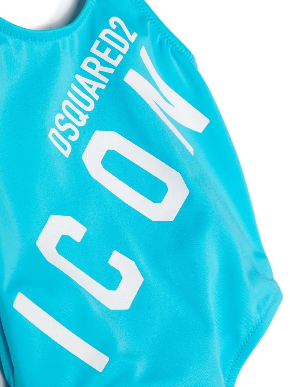 Cyan-blå, hvid, strækbart design, Icon-motiv, logotryk foran, dyb halsudskæring, dyb rygudskæring. Badetøj skal prøves uden på eget tøj.