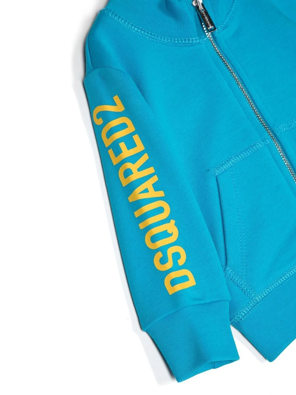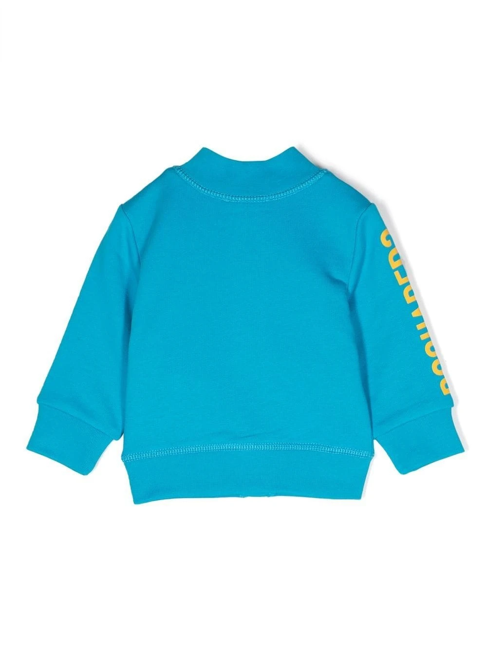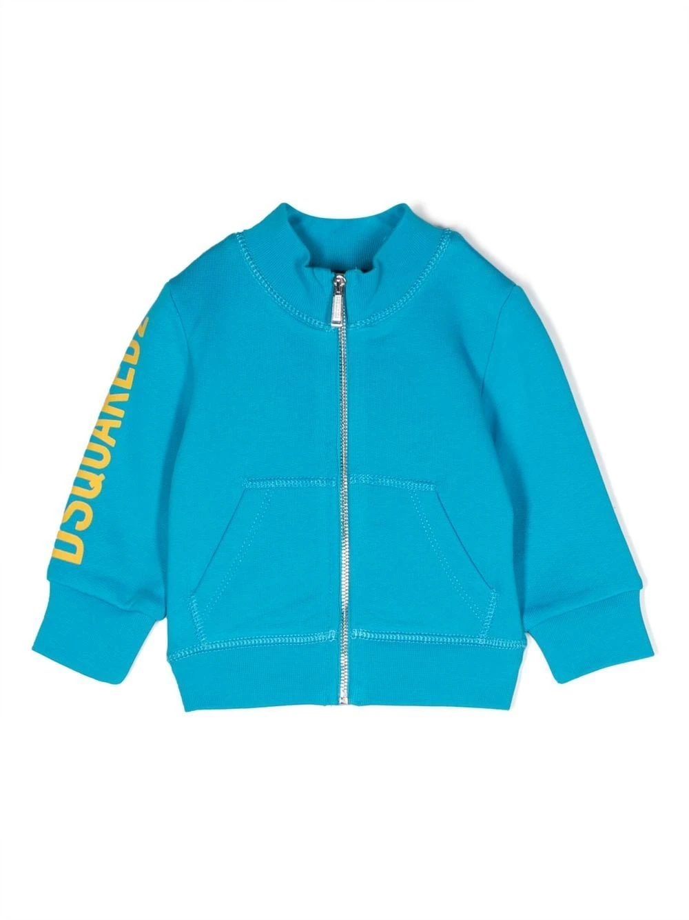 Blå, bomuld, logotryk på ærmet, opretstående krave, lynlåslukning foran, lange ærmer, to punglommer foran, lige søm.