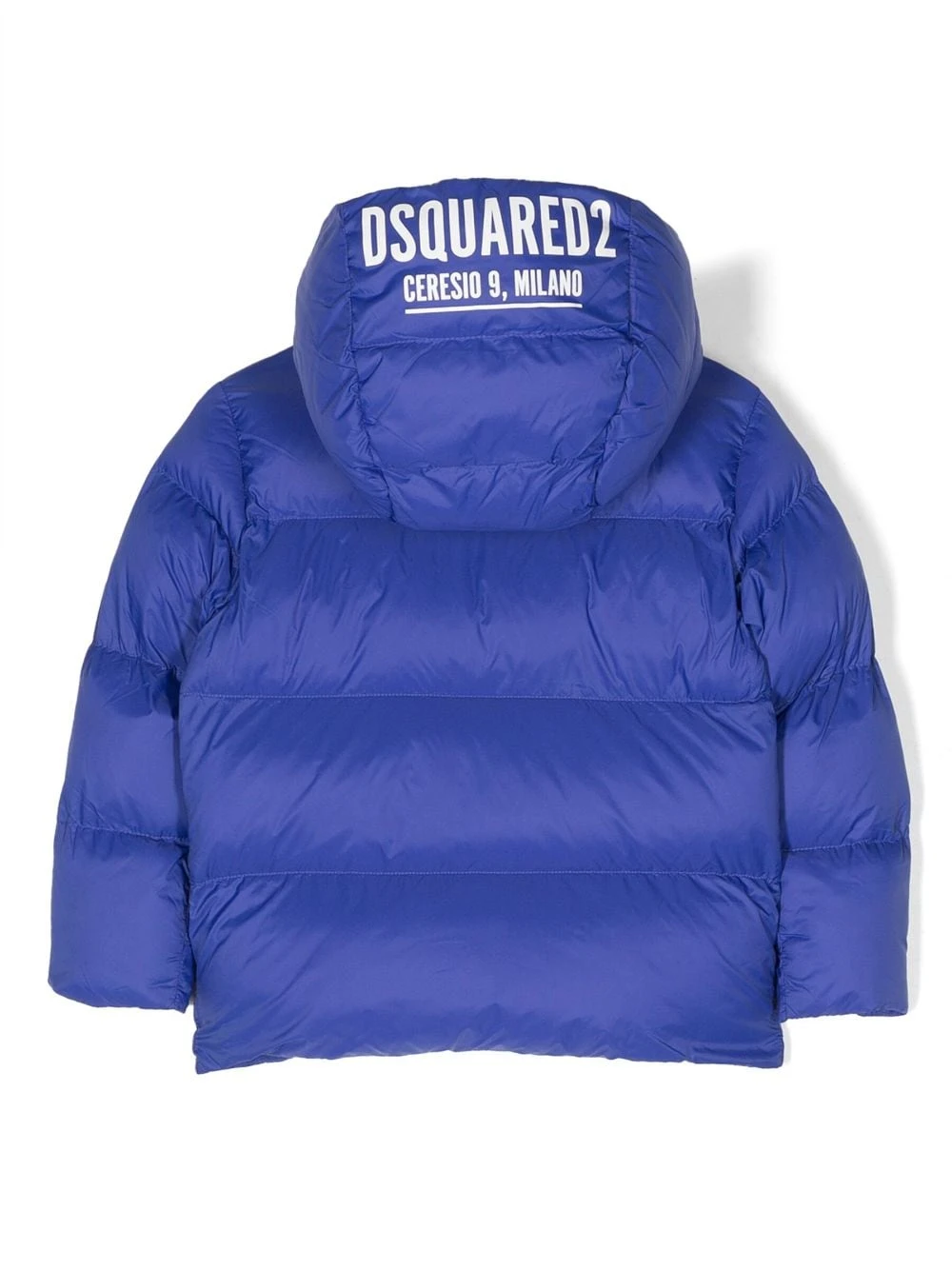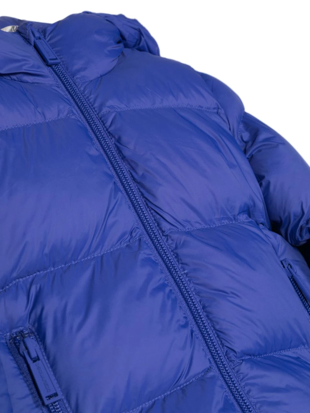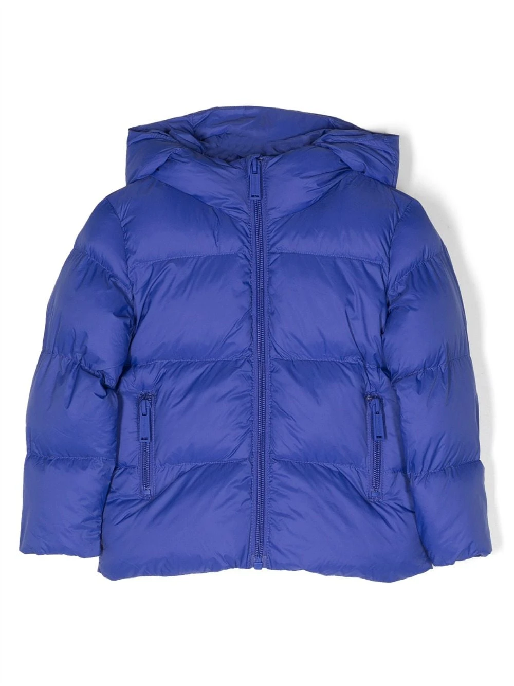 Kongeblå, polstret design, quiltet, logotryk på hætten, lynlåslukning foran, lange ærmer, lynlåslommer foran, lige søm.