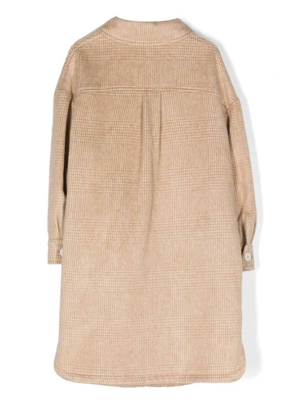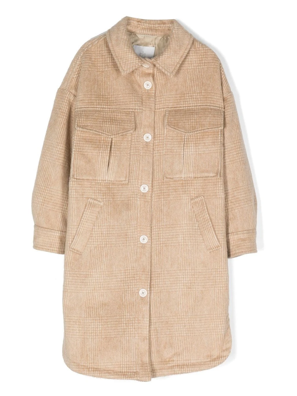 Beige, uldblanding, ternet tryk, klassisk krave, lange ærmer, knaplukning foran, to brystlommer med flaplukning, to stiklommer i siden.