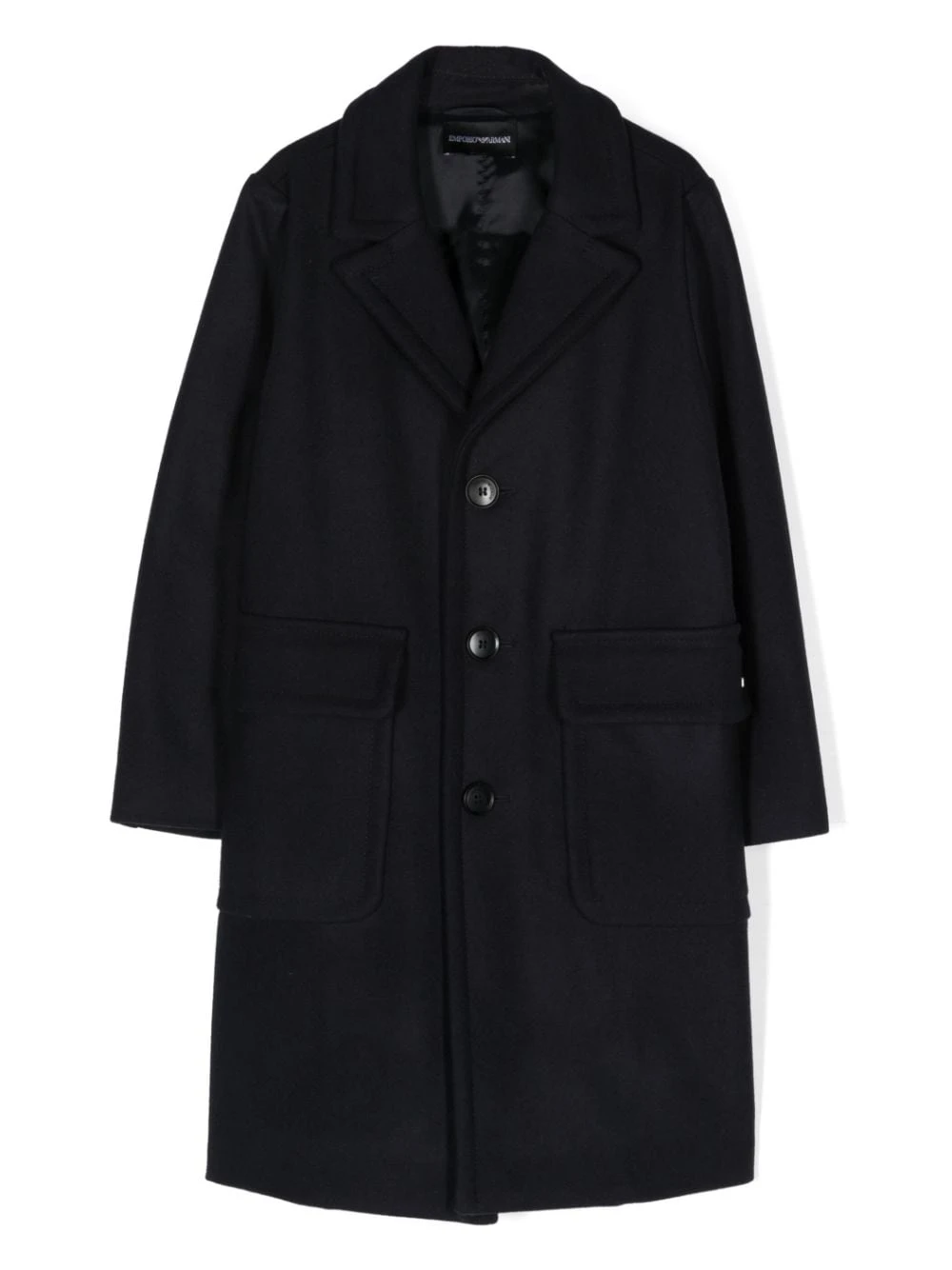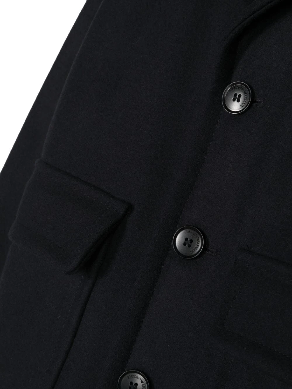 Midnatsblå, jomfru-uldblanding, hakreverser, lange ærmer, flaplommer foran.