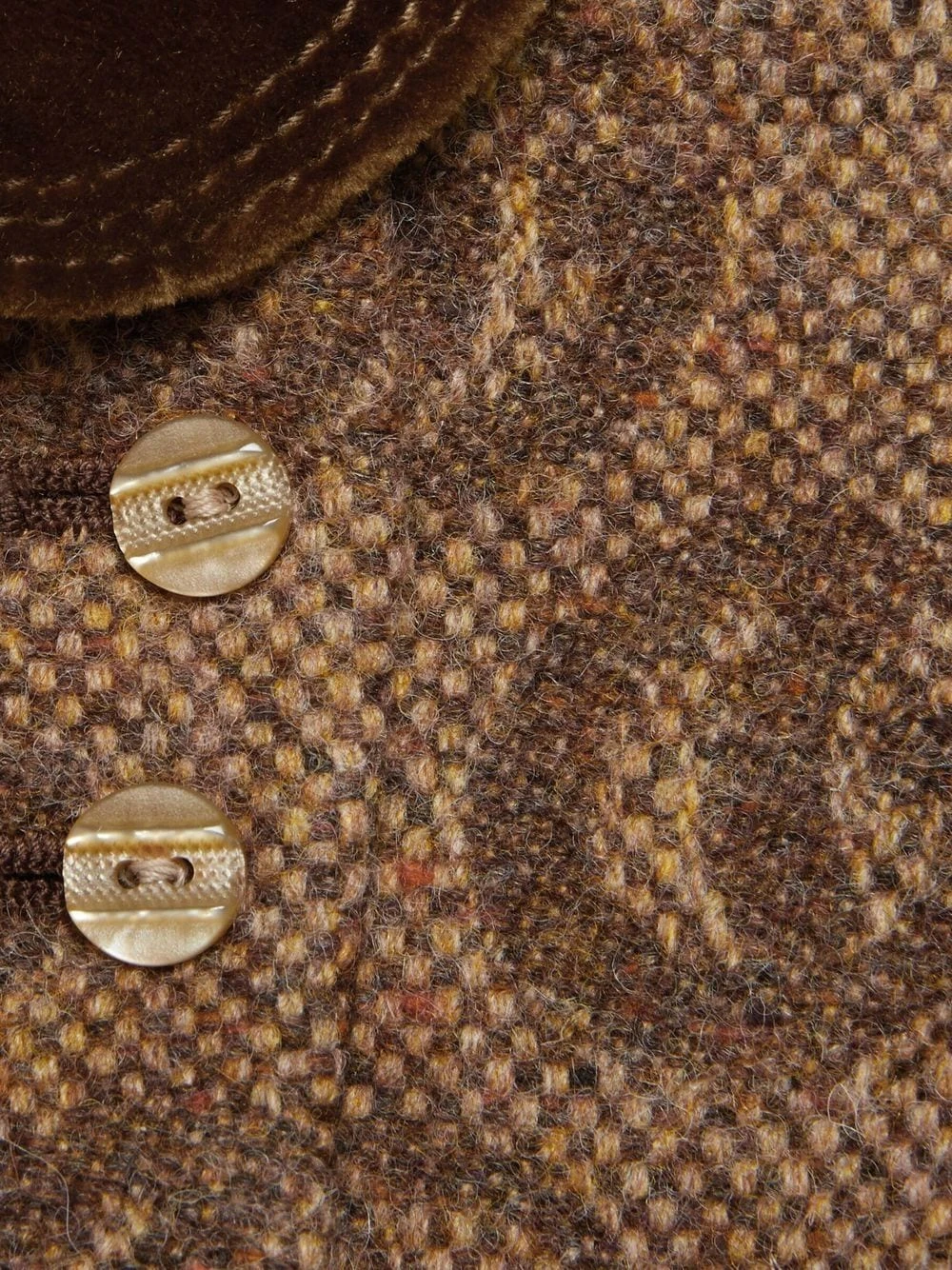 Brun, uld- og bomuldsblanding, Peter Pan-krave, lange ærmer, dobbeltradet knaplukning.