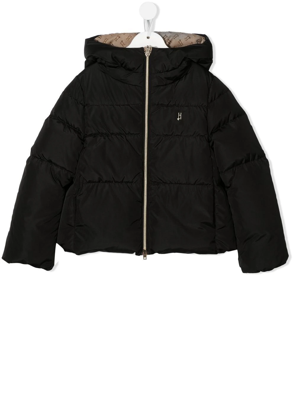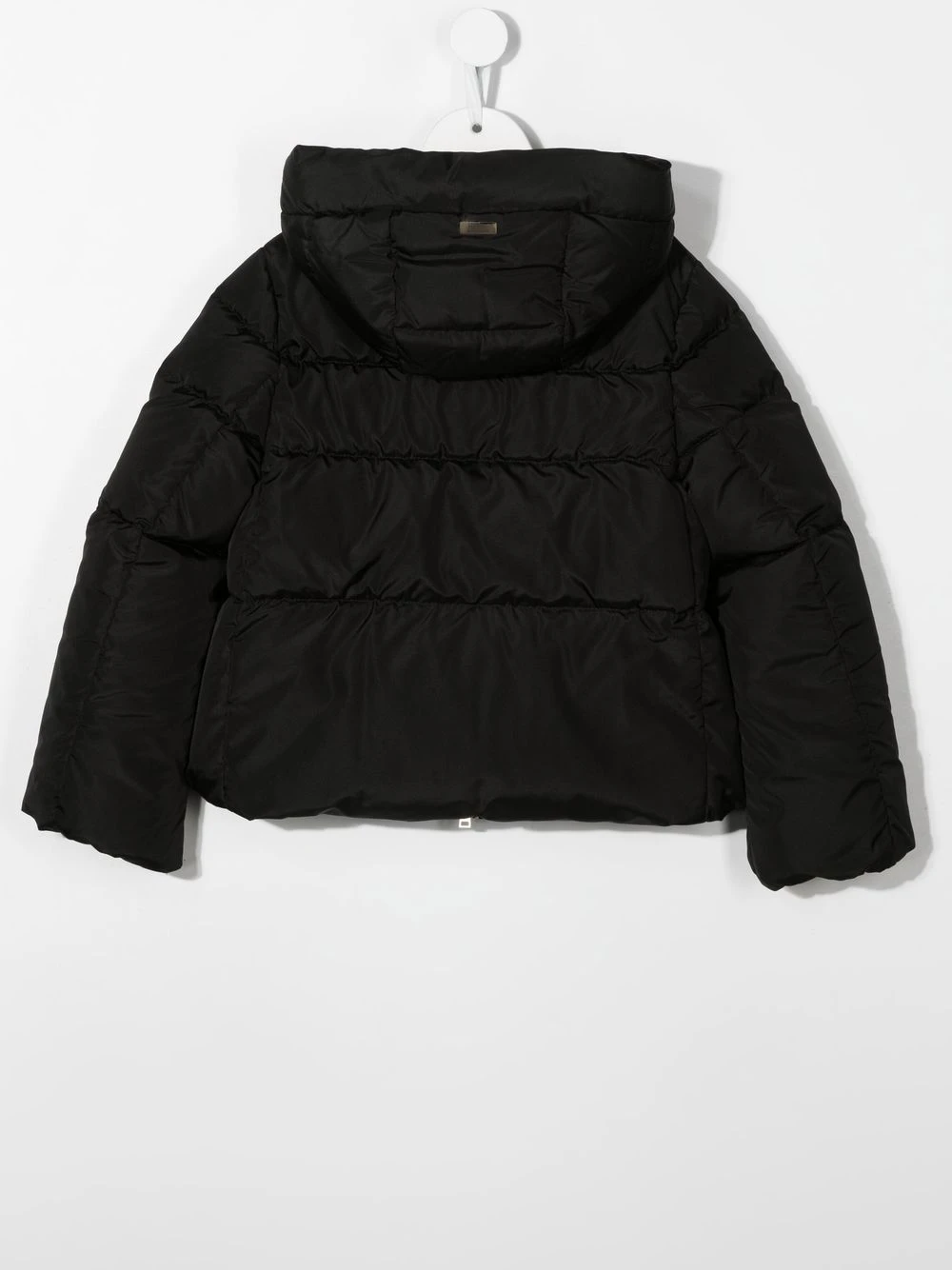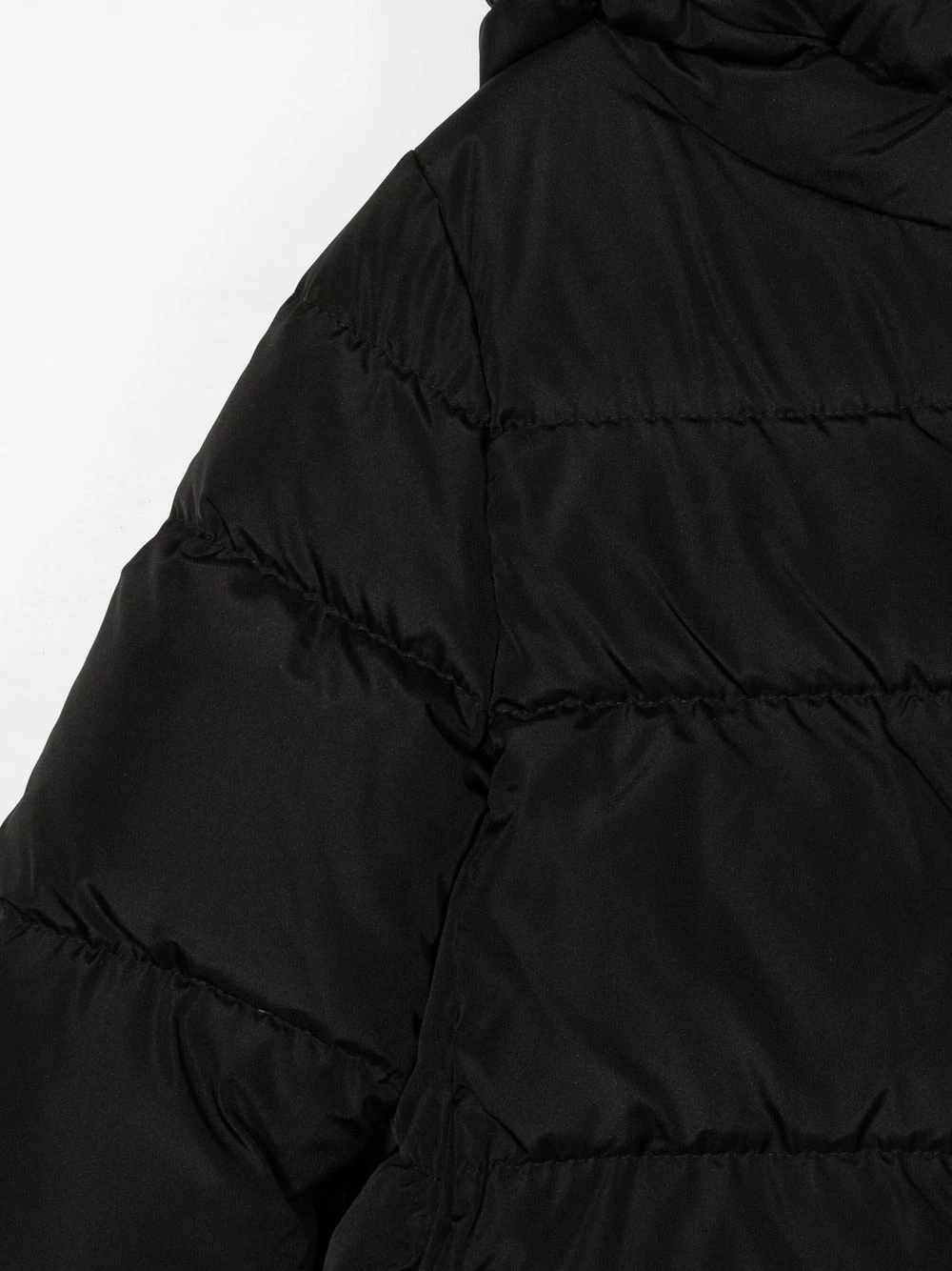 Sort, gåsedun, fjerdun, klassisk hætte, lange ærmer, logomærke på brystet, to stiklommer i siden, polstret design.