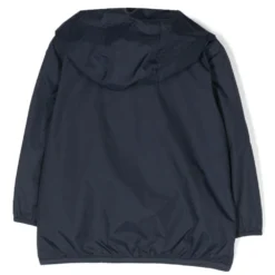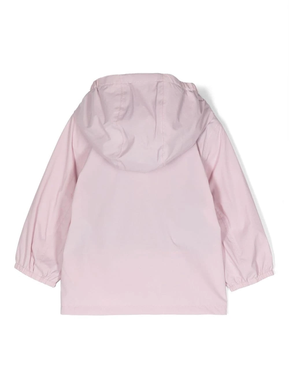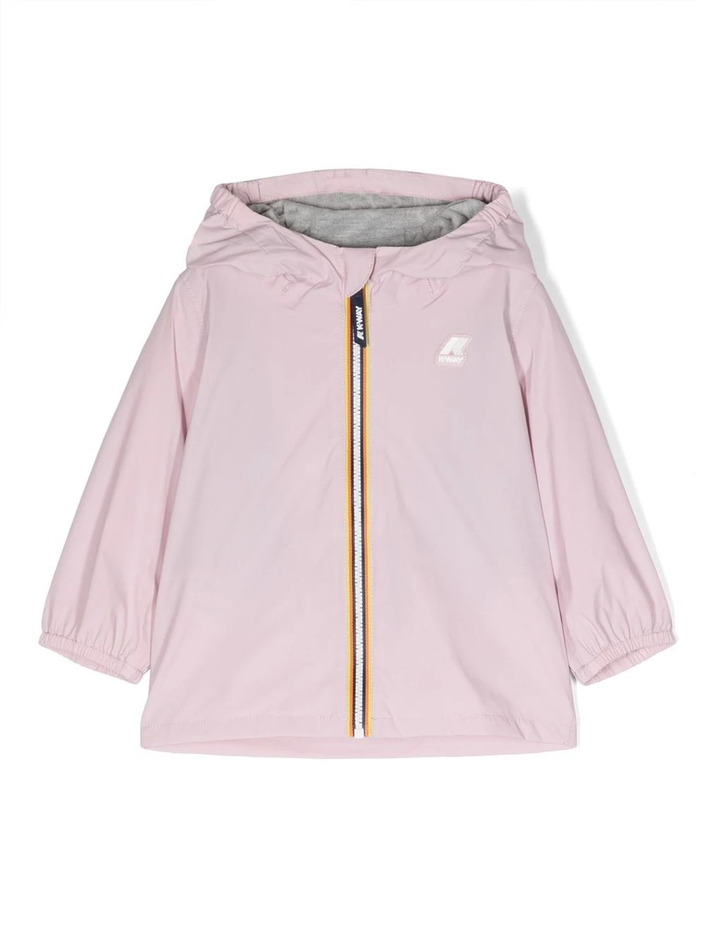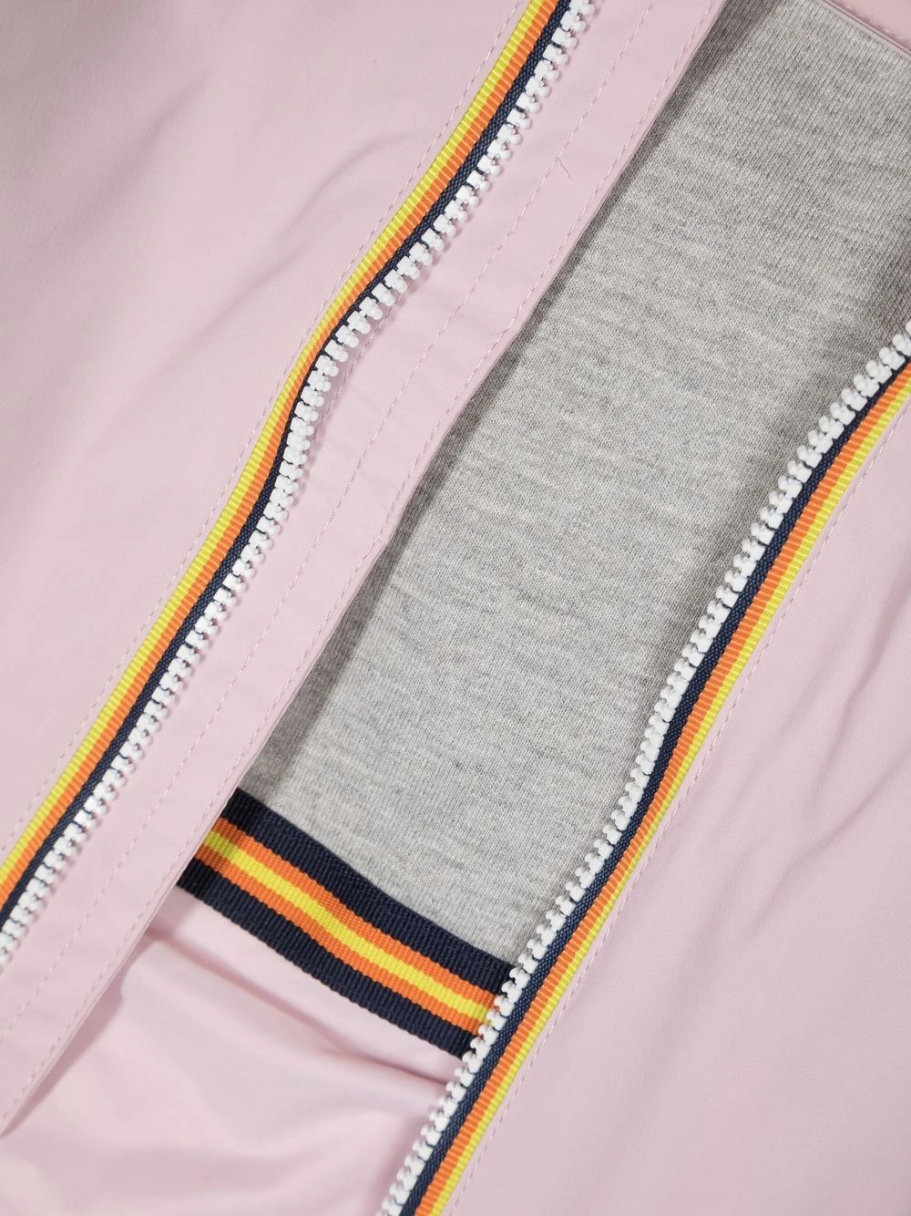 Lyserød, logotryk på brystet, stribedetalje, jersey-for, vandtæt, lige søm, lynlåslukning foran, klassisk hætte, lange ærmer, elastikopslag.