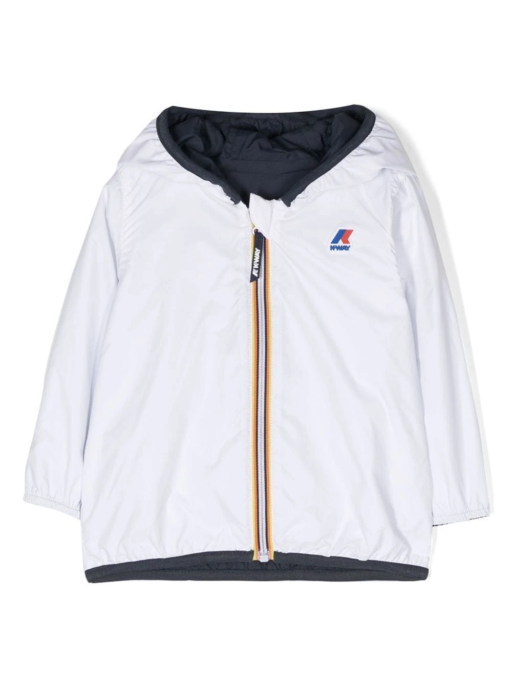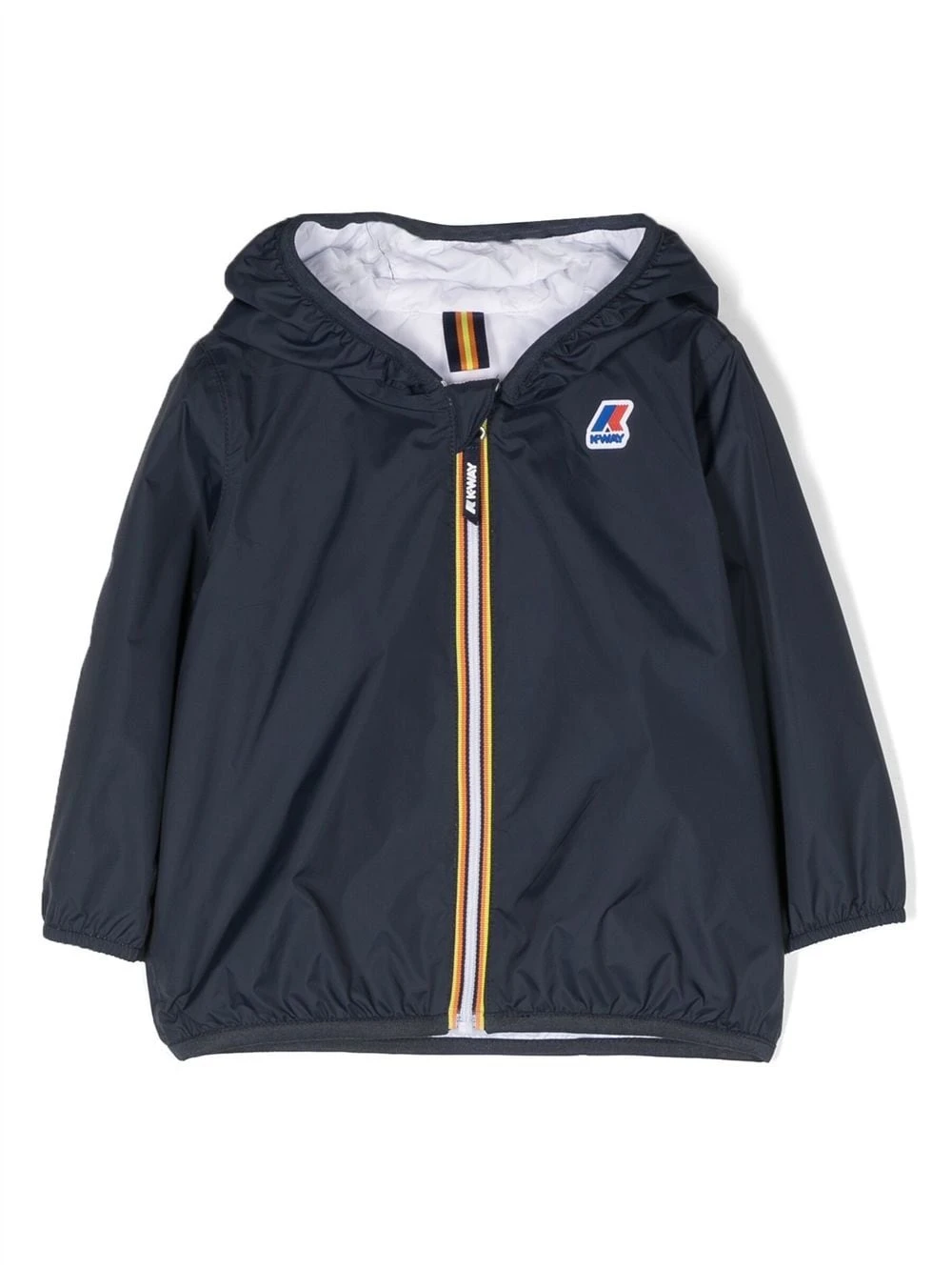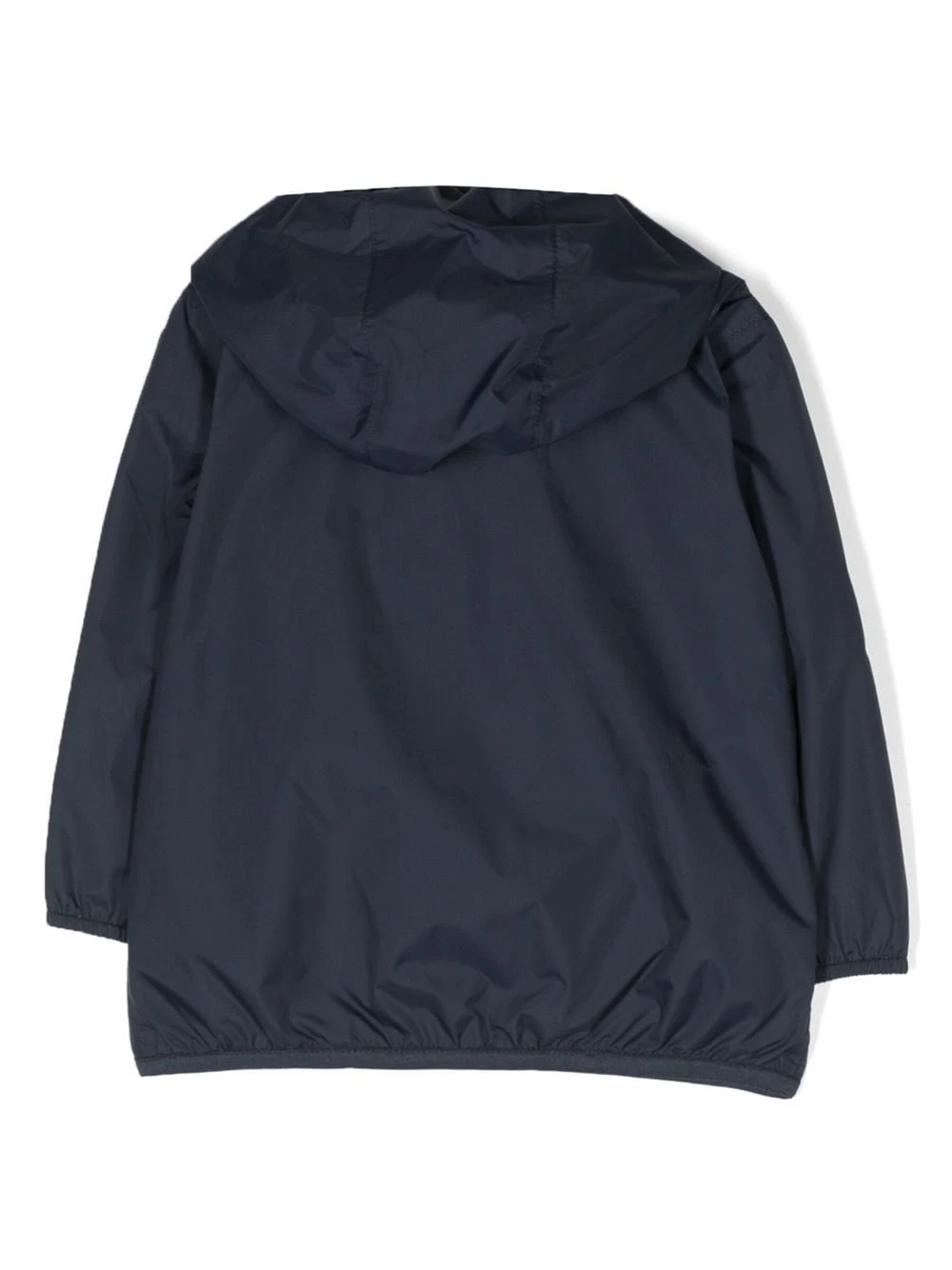 Marineblå, tofarvet design, vendbar, logomærke på brystet, klassisk hætte, lynlåslukning foran, lange ærmer, elastikopslag, elastisk søm.