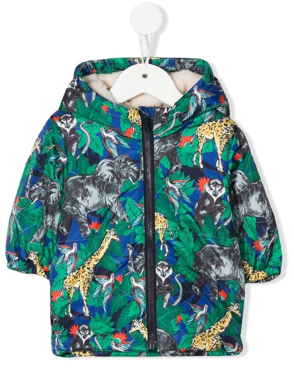 Flerfarvet, heldækkende grafisk tryk, polstret design, imiteret lammeskindsfor, klassisk hætte, høj hals, lynlåslukning foran, lange ærmer, lige søm.
