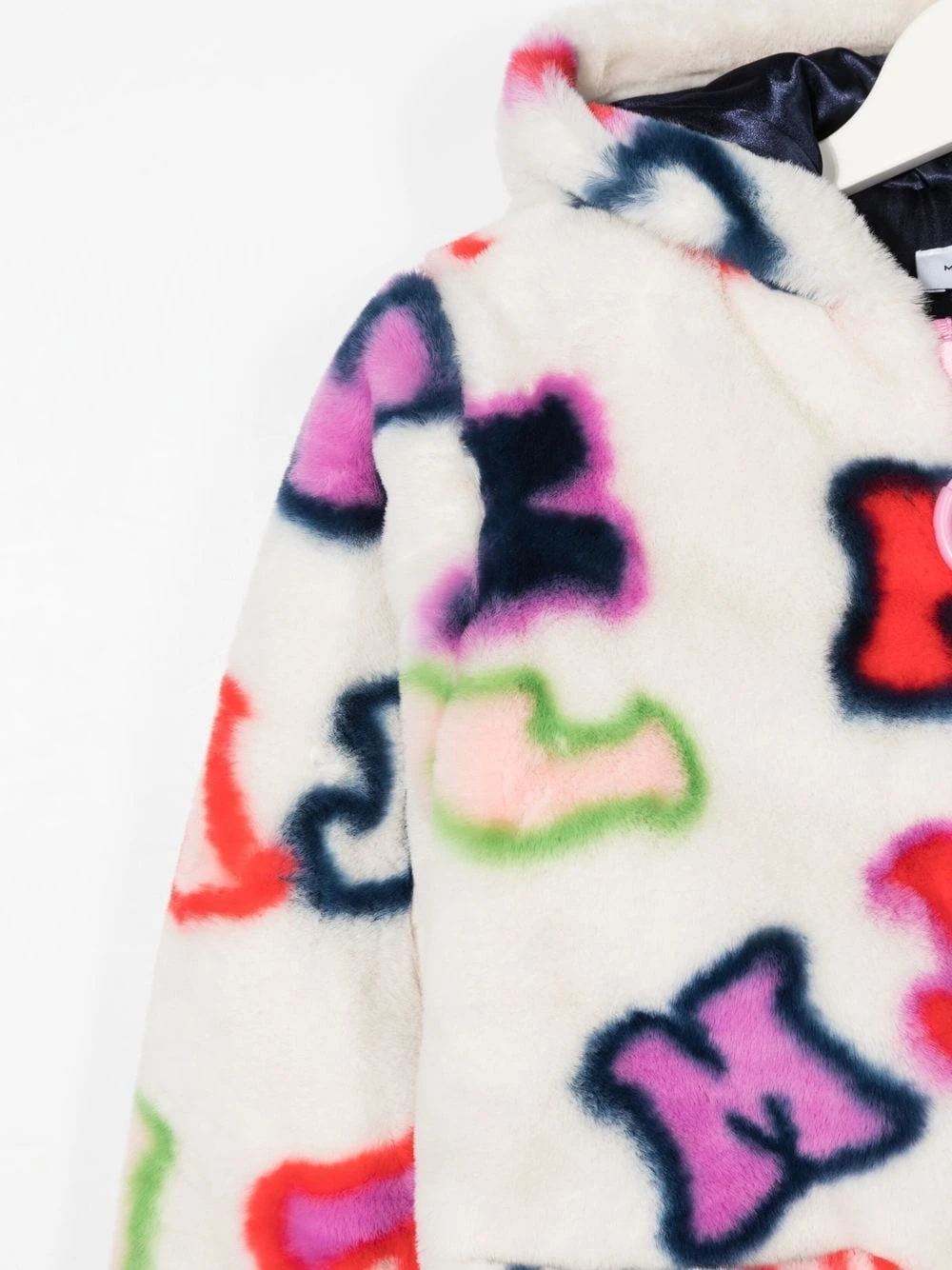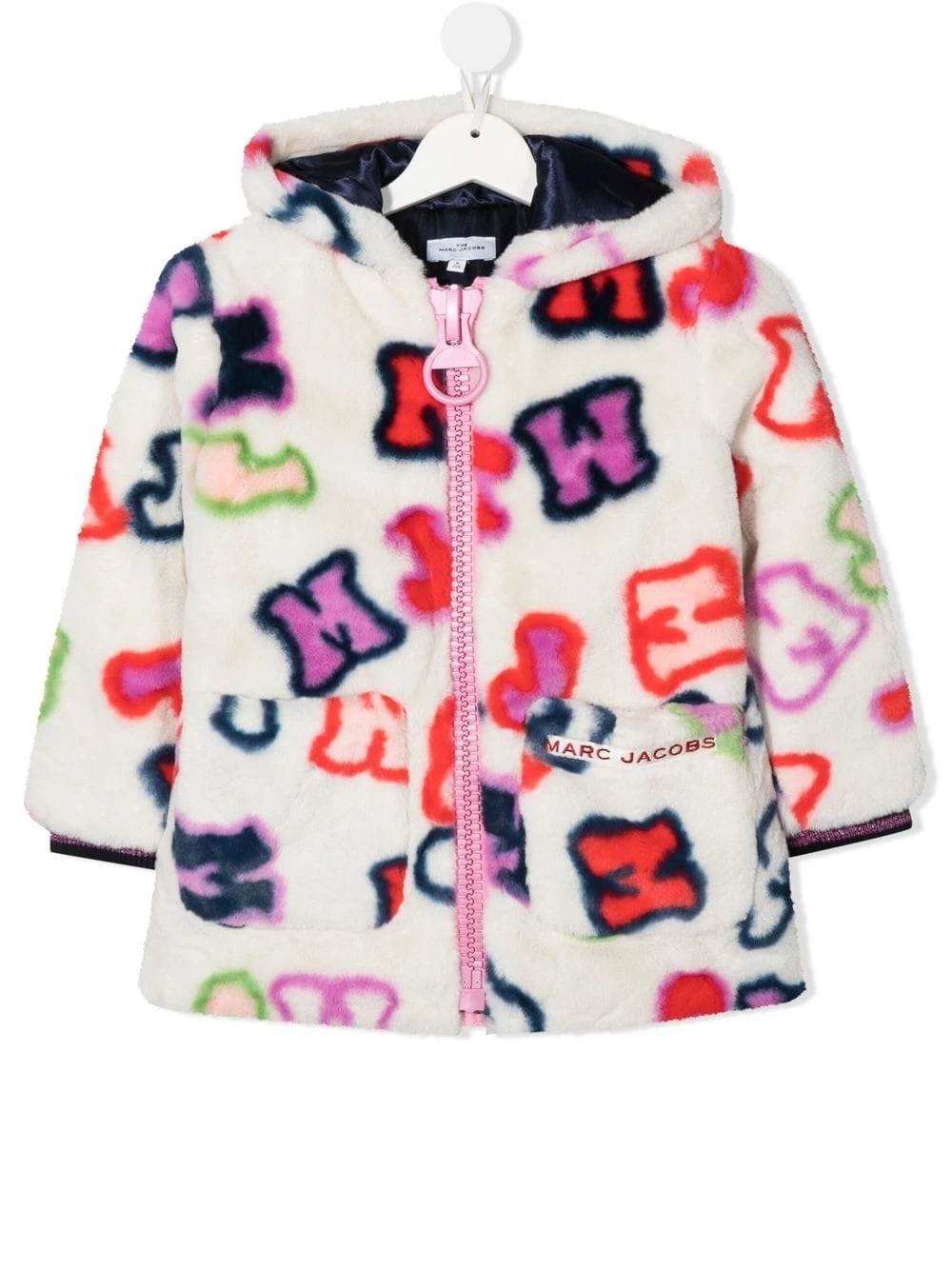Råhvid, flerfarvet, heldækkende grafisk tryk, klassisk hætte, lynlåslukning foran, lange ærmer, to påsyede lommer foran, lige søm.