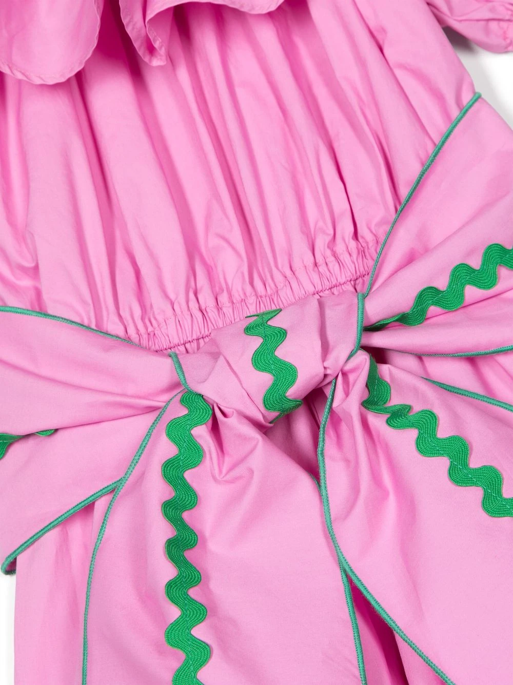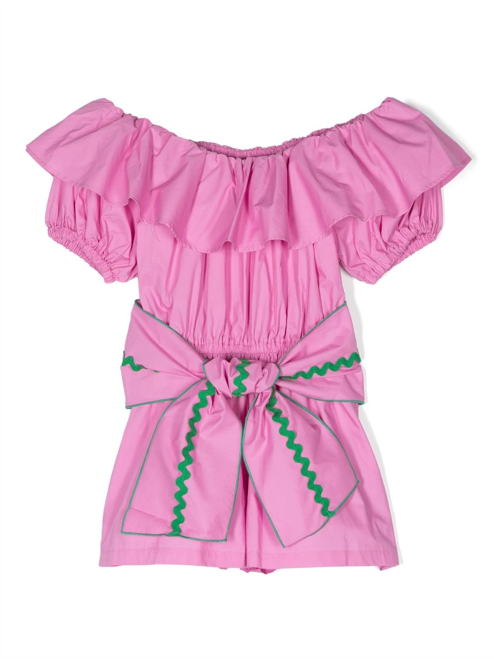 Lyserød, bomuld, flæsedetalje, samlet detalje, off-shoulder, bådudskæring, korte pufærmer, bælte i taljen, lige søm, lårhøj.