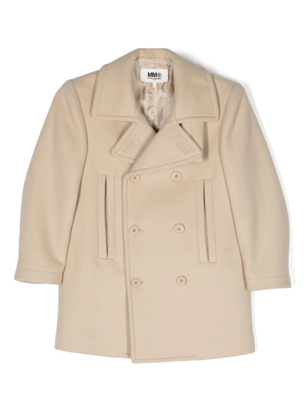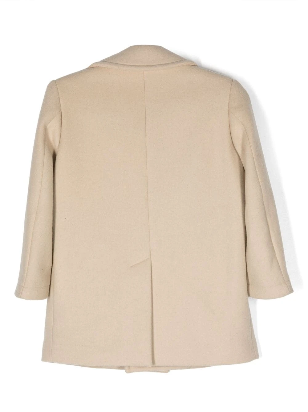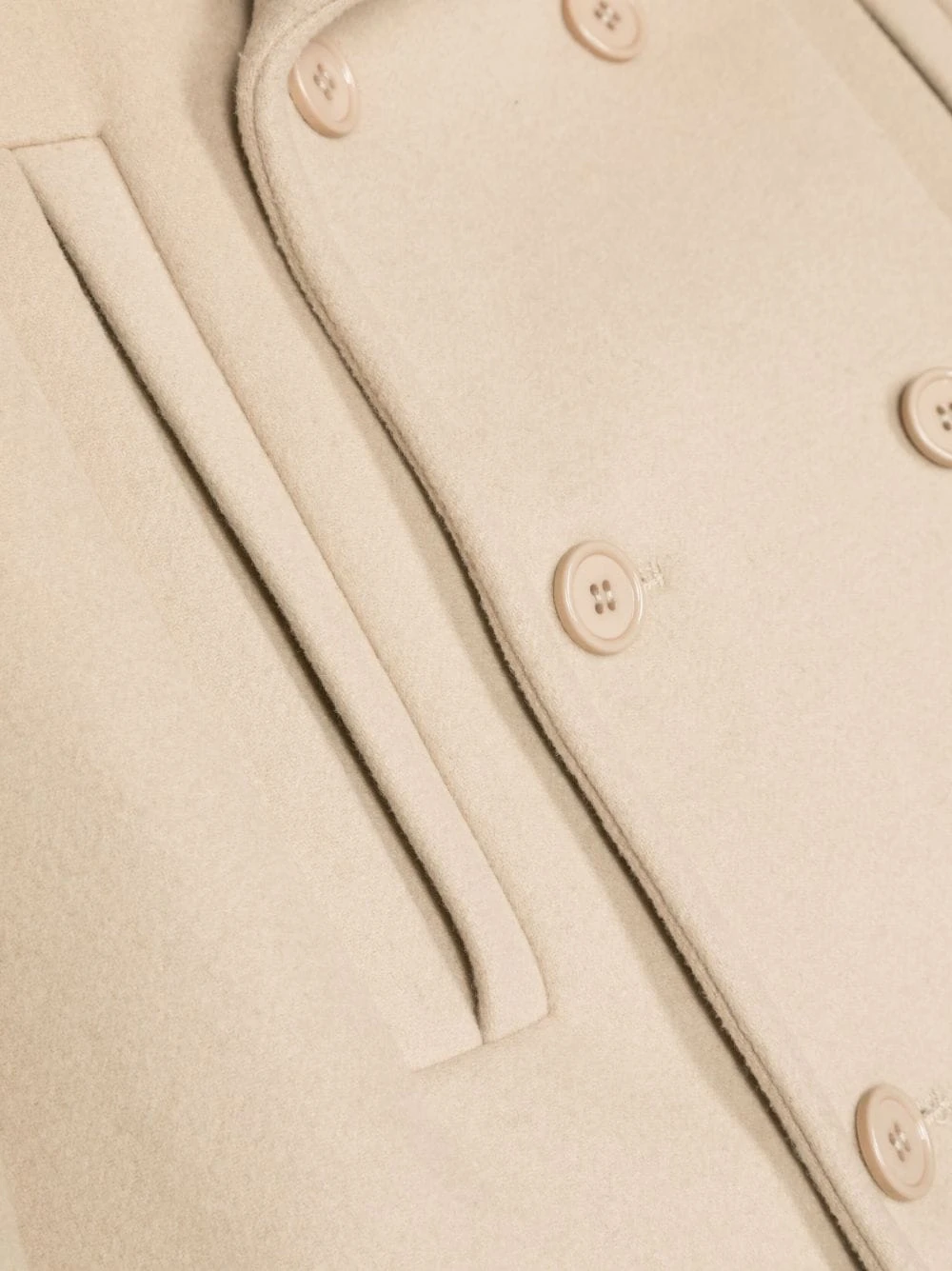 Lysebrun, uldblanding, dobbeltradet knaplukning, spidsreverser, lange ærmer, to indsatte lommer i siden, lige søm.