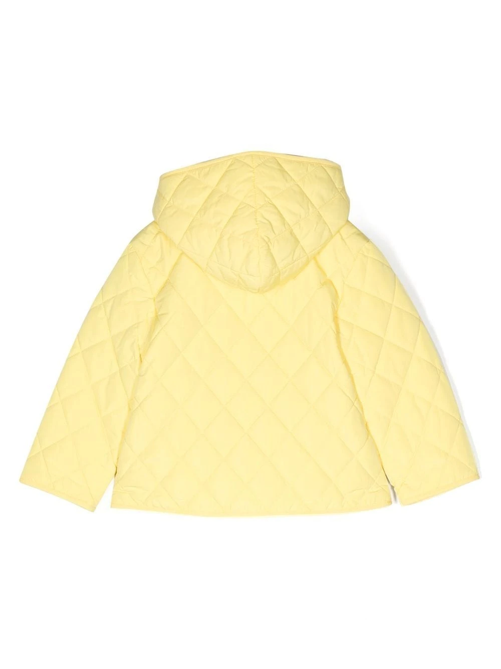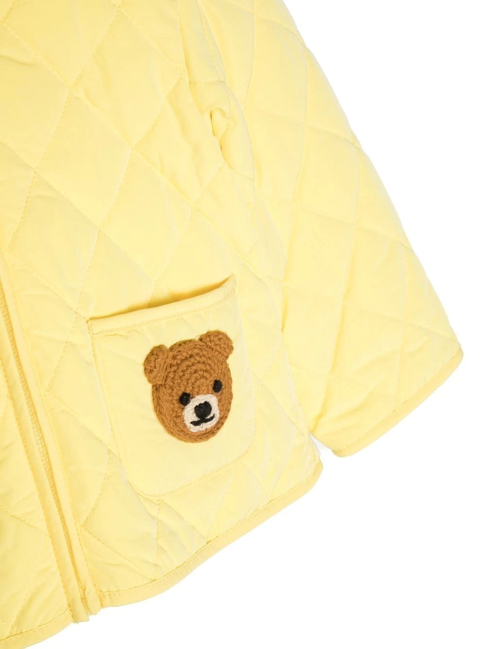 Lys citrongul, diamantquiltet, Teddy Bear-motiv, broderet logo foran, logo-vedhæng, lynlåslukning foran, klassisk hætte, to påsyede lommer foran, lange ærmer, lige søm.