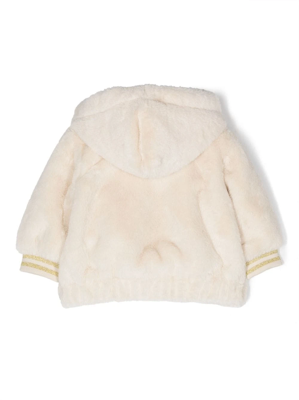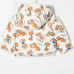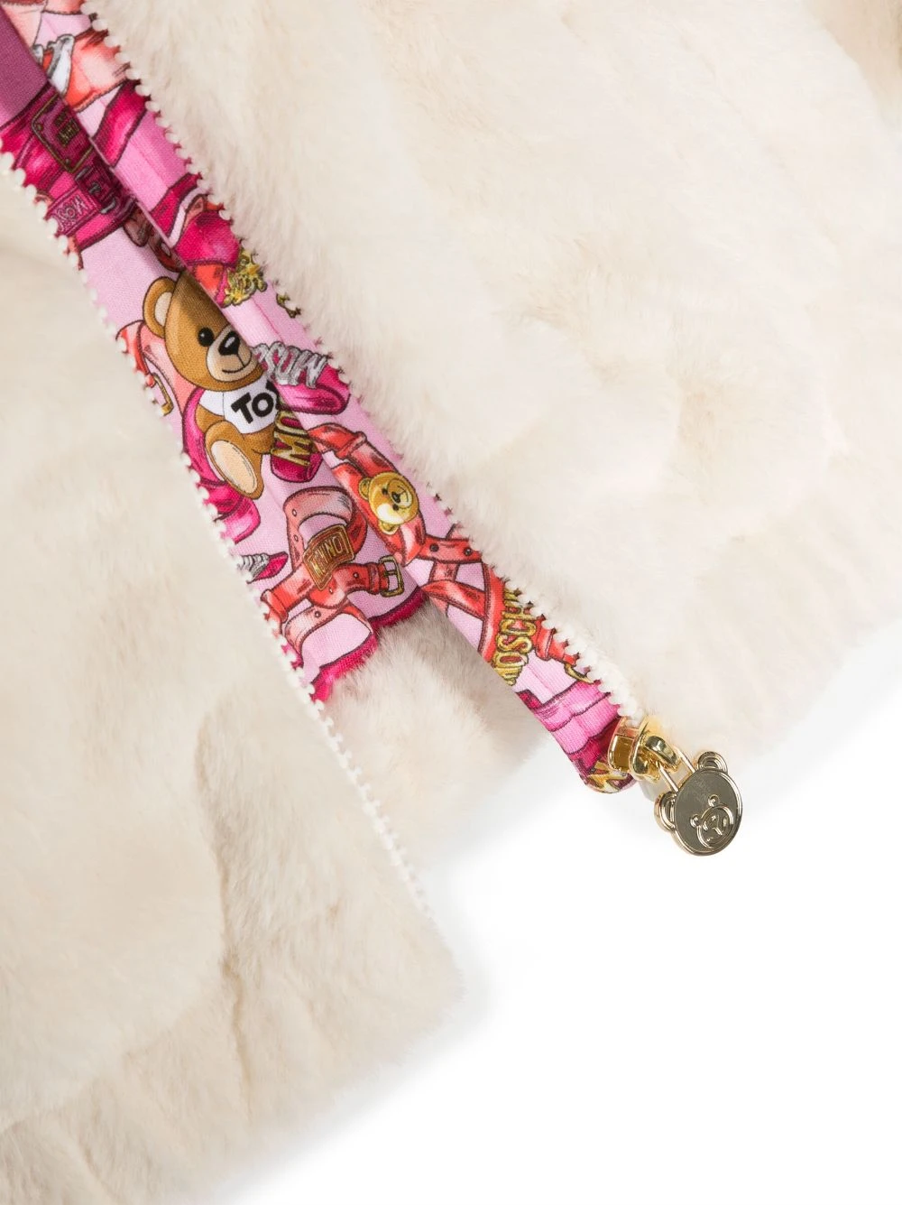 Hvid/flerfarvet, bomuld, imiteret pelsdesign, klassisk hætte, lynlåslukning foran, lange ærmer, lige søm.