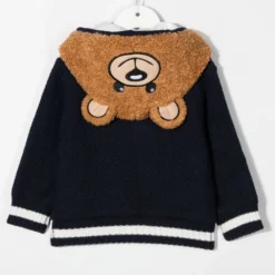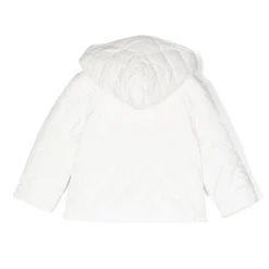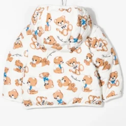 Sort, polstret design, quiltet finish, Teddy Bear-motiv, høj hals, klassisk hætte, logoudsmykkede sidepaneler, to lommer med lynlåslukning, lynlåslukning foran, lige søm.