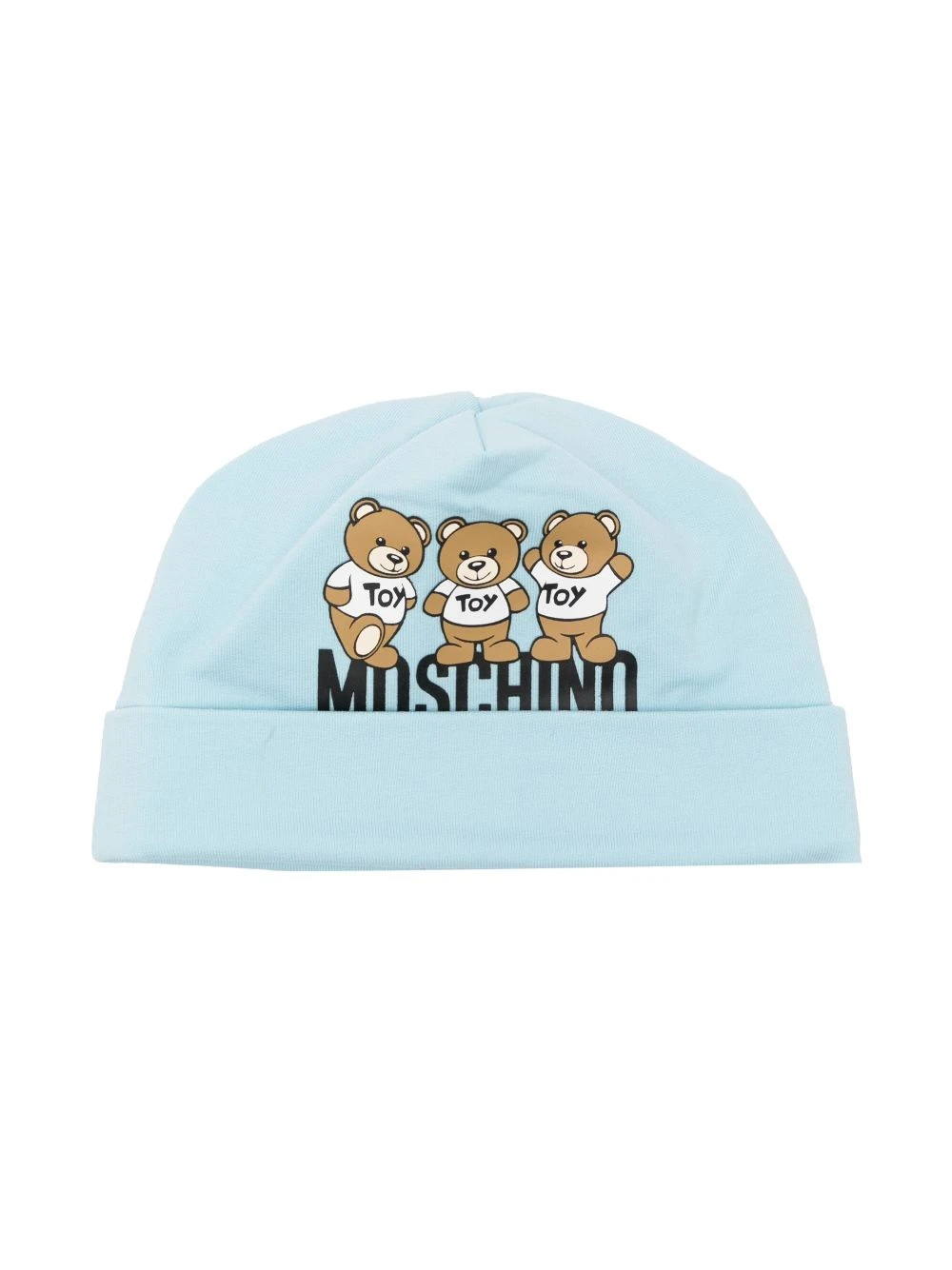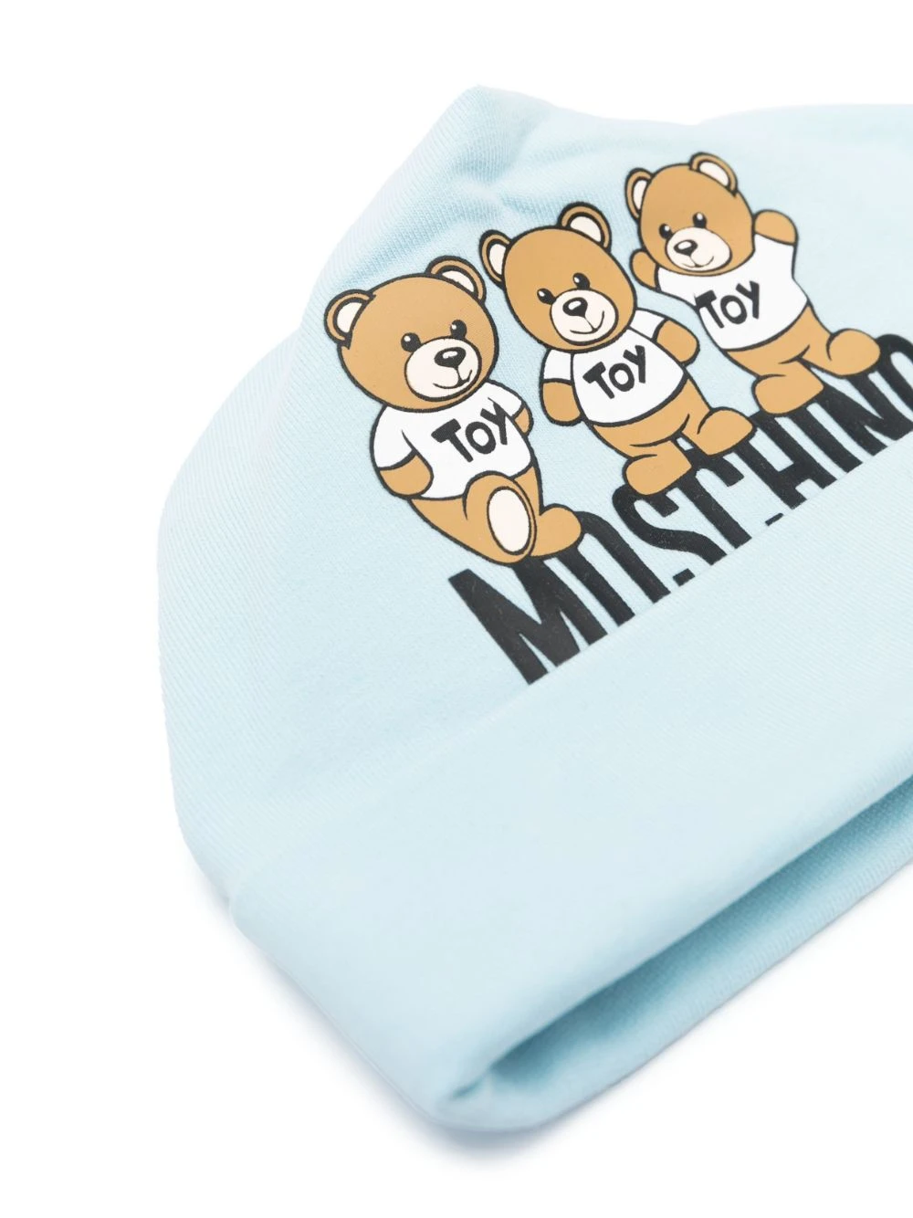 Lyseblå, strækbar bomuld, opadvendt skygge, bamsetryk, logotryk foran, strækbart design.