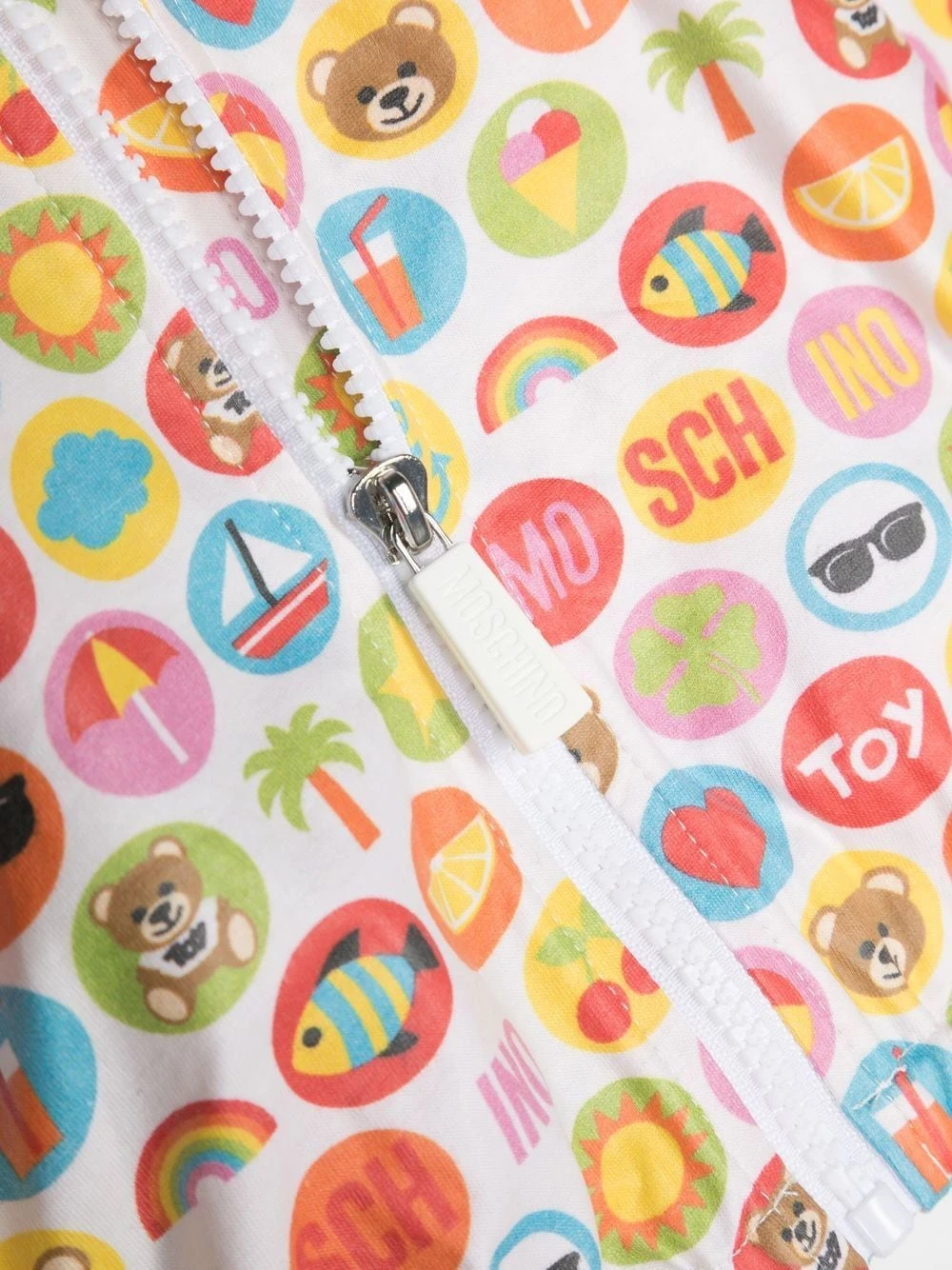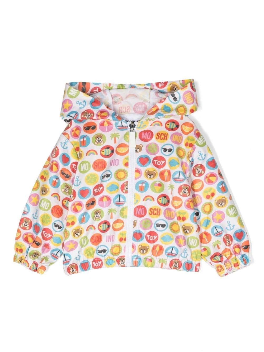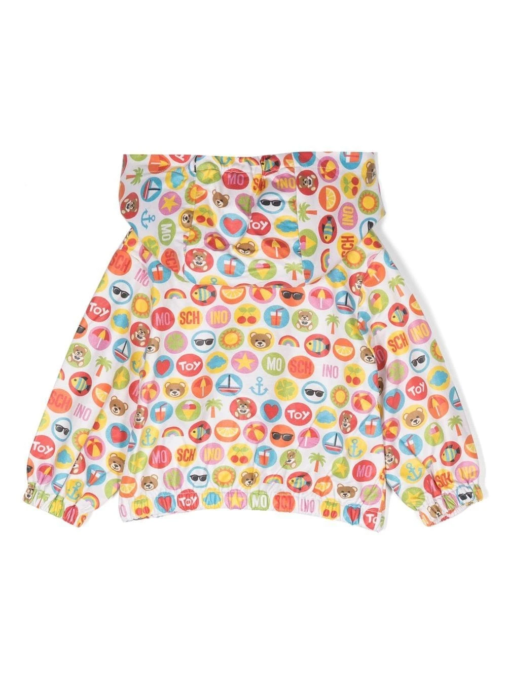 Hvid/flerfarvet, bomuldsblanding, letvægtskonstruktion, heldækkende grafisk tryk, klassisk hætte, lynlåslukning foran, lange ærmer, elastikopslag, elastisk søm.