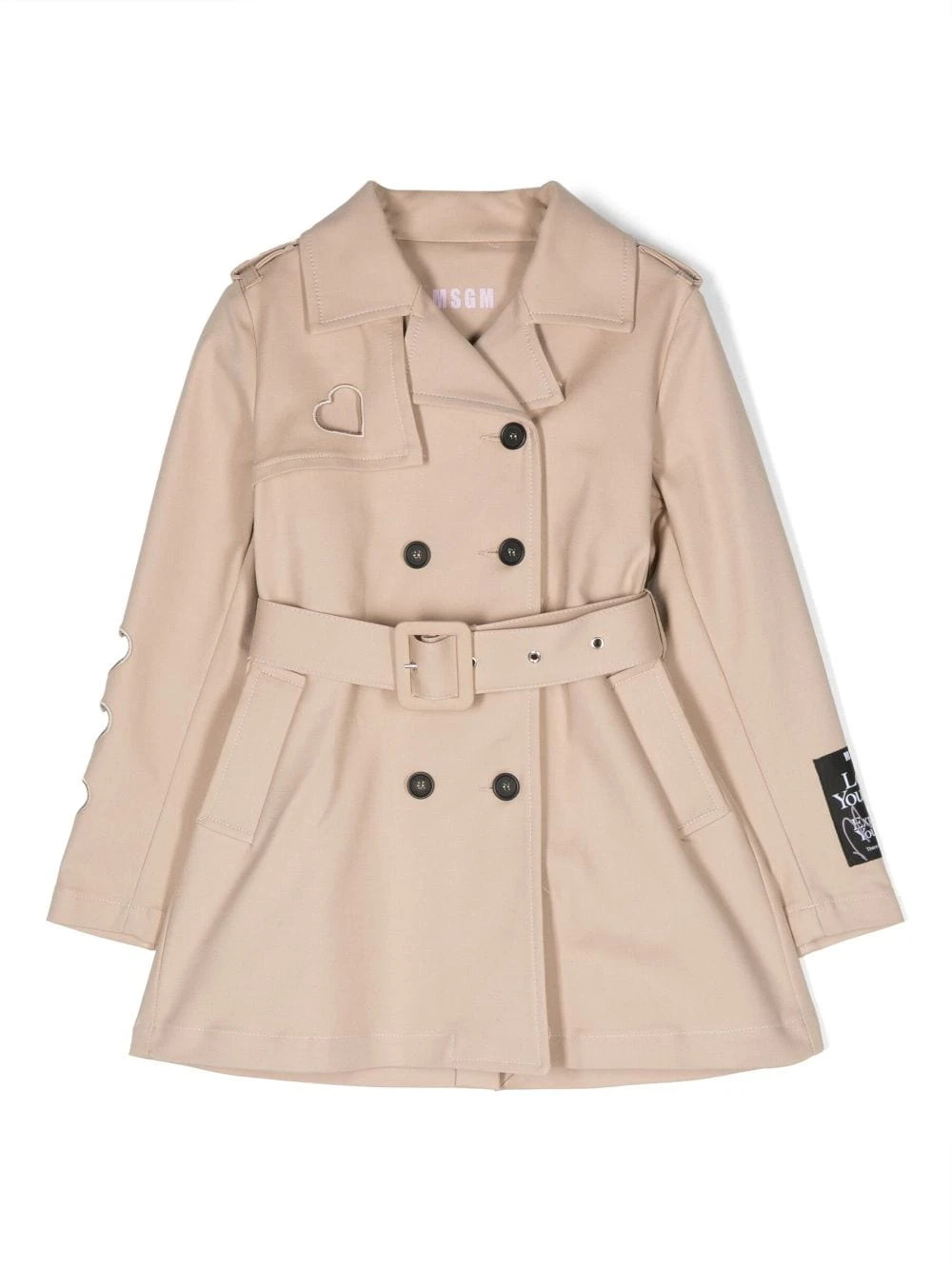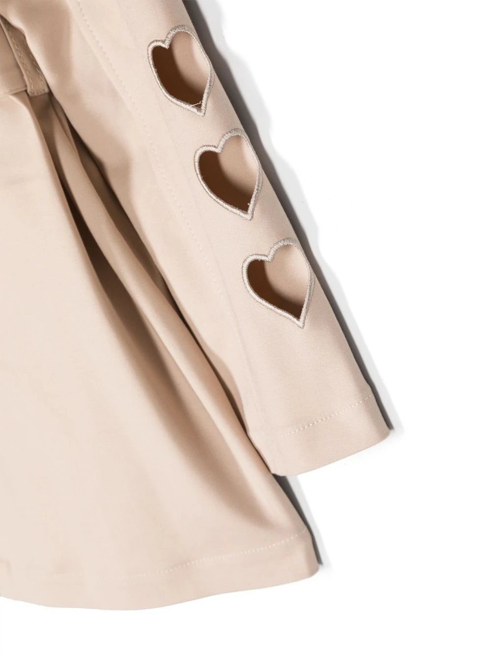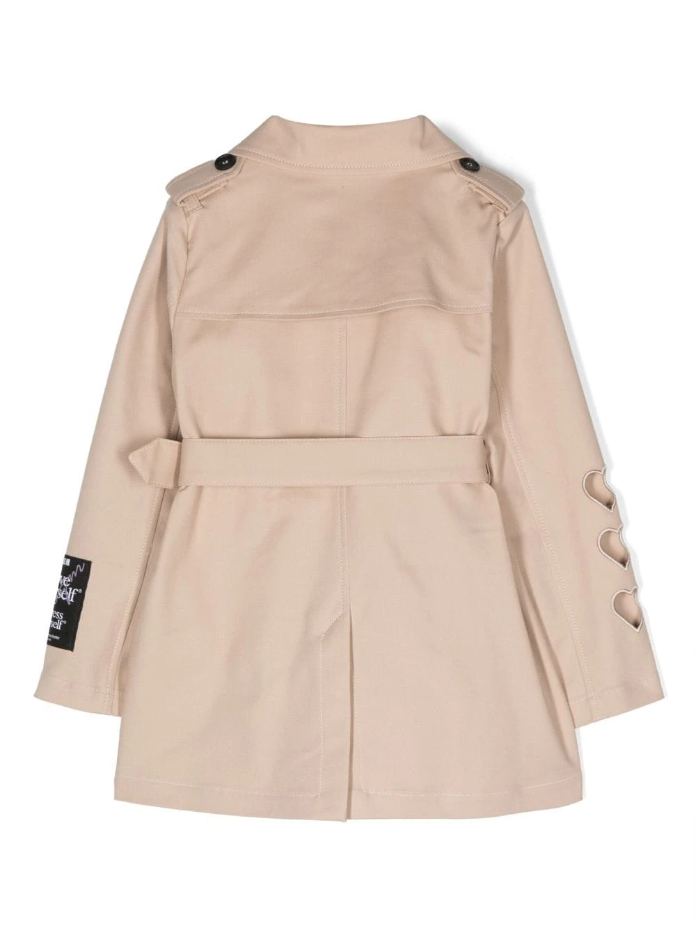 Lys beige, bomuldsblanding, udskæringsdetalje, logomærke på ærmet, krave med hak, imiteret dobbeltradet front, bælte i taljen, lange ærmer, American-slids bagpå, lige søm, to indsatte lommer i siden.