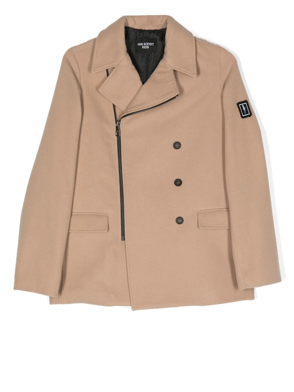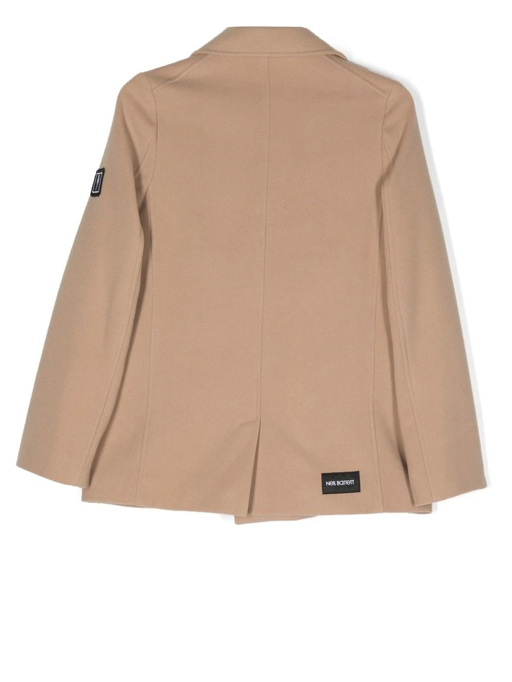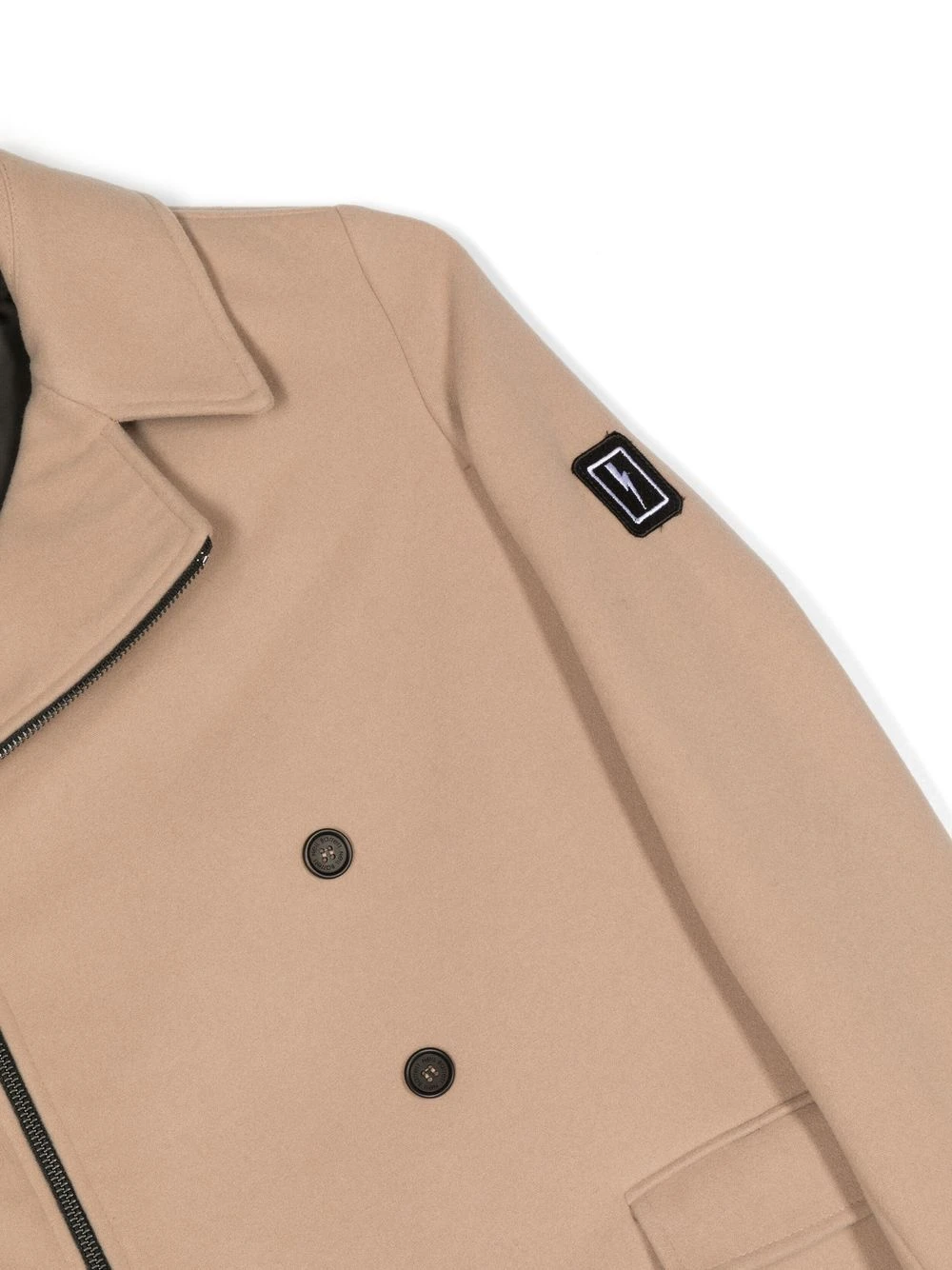 Kamelbrun, logomærke på ærmet, logomærke bagpå, krave med hak, knap- og lynlåslukning foran, lange ærmer, to flaplommer foran, slids i midten bagpå.