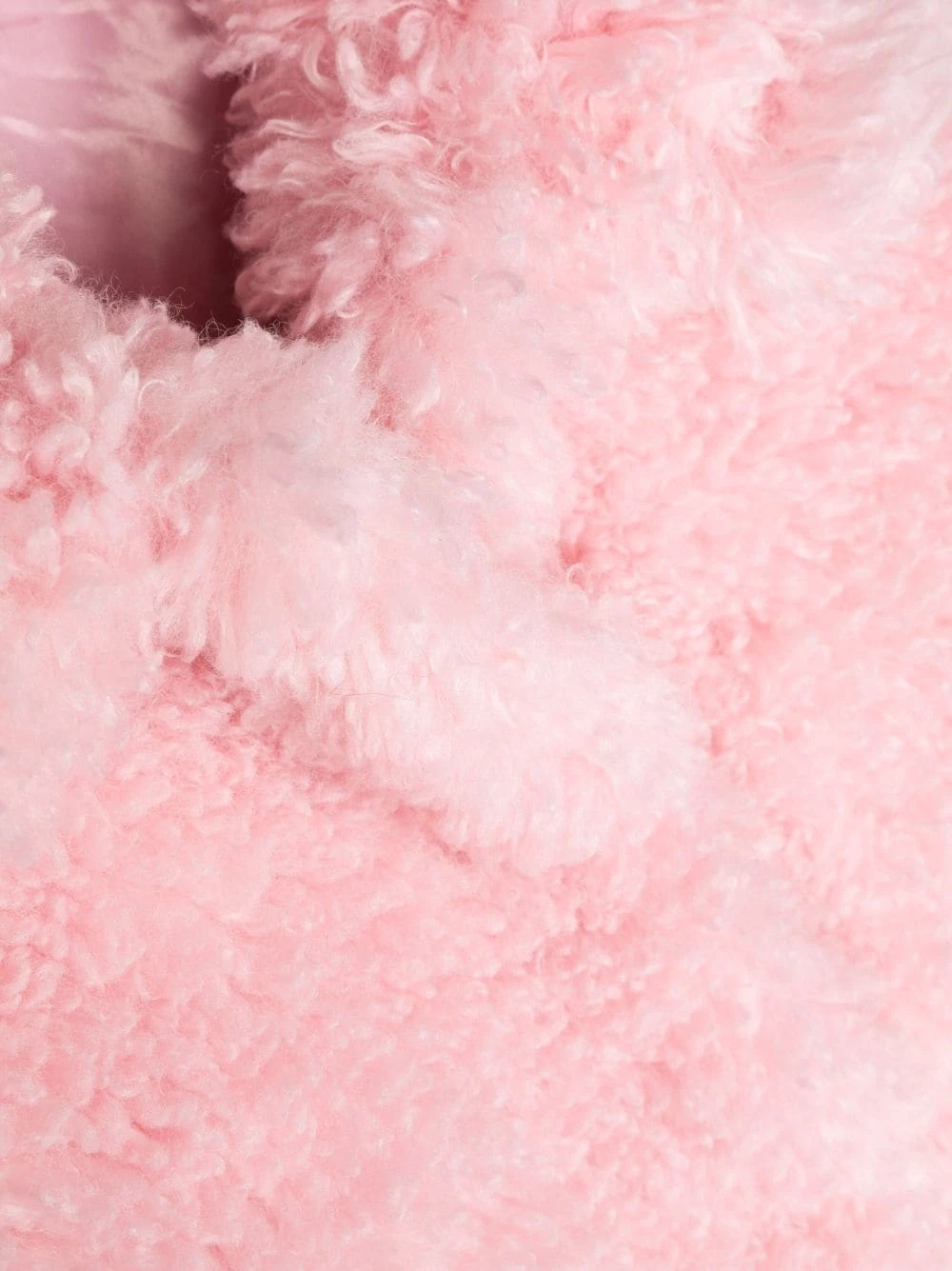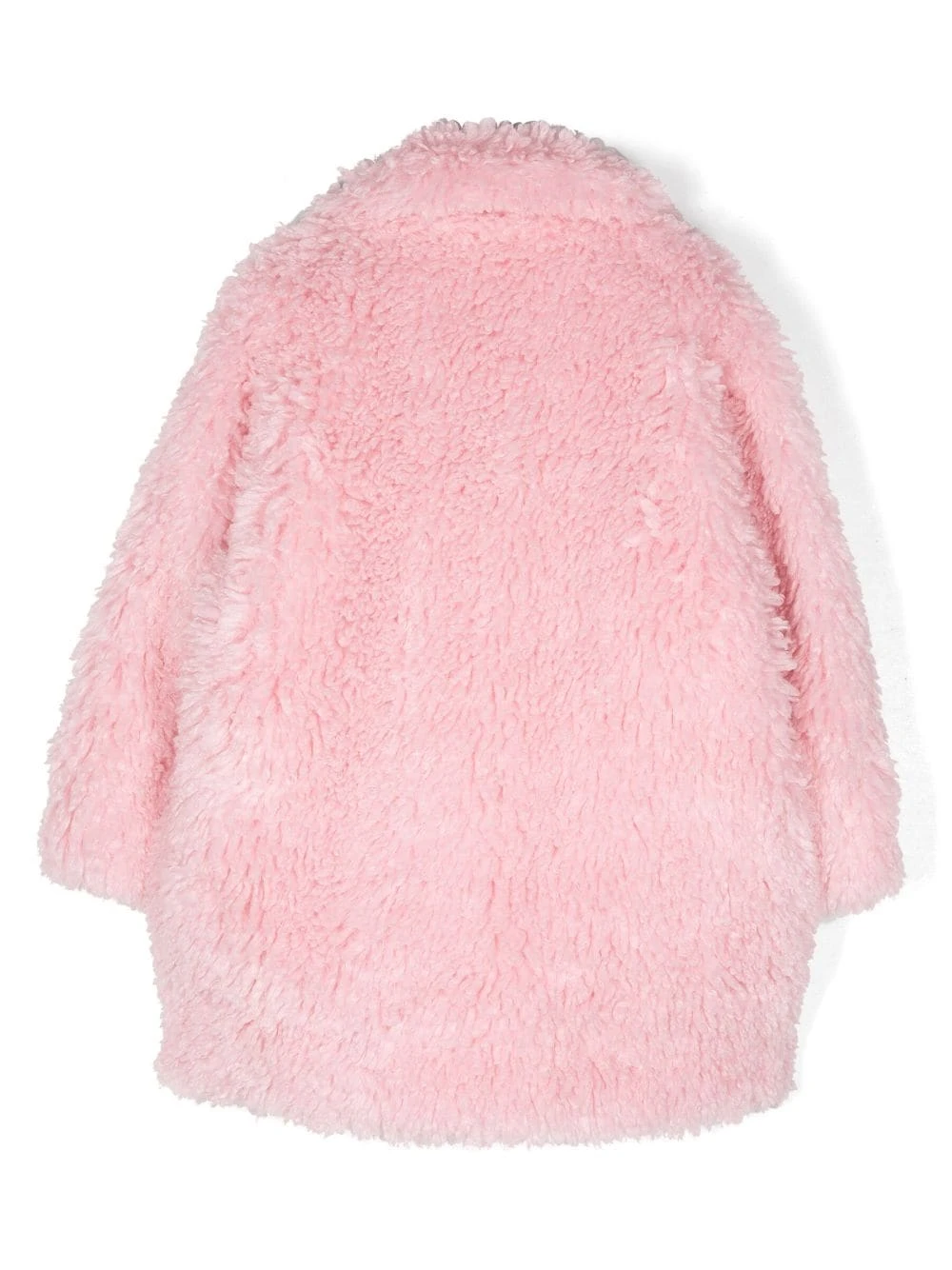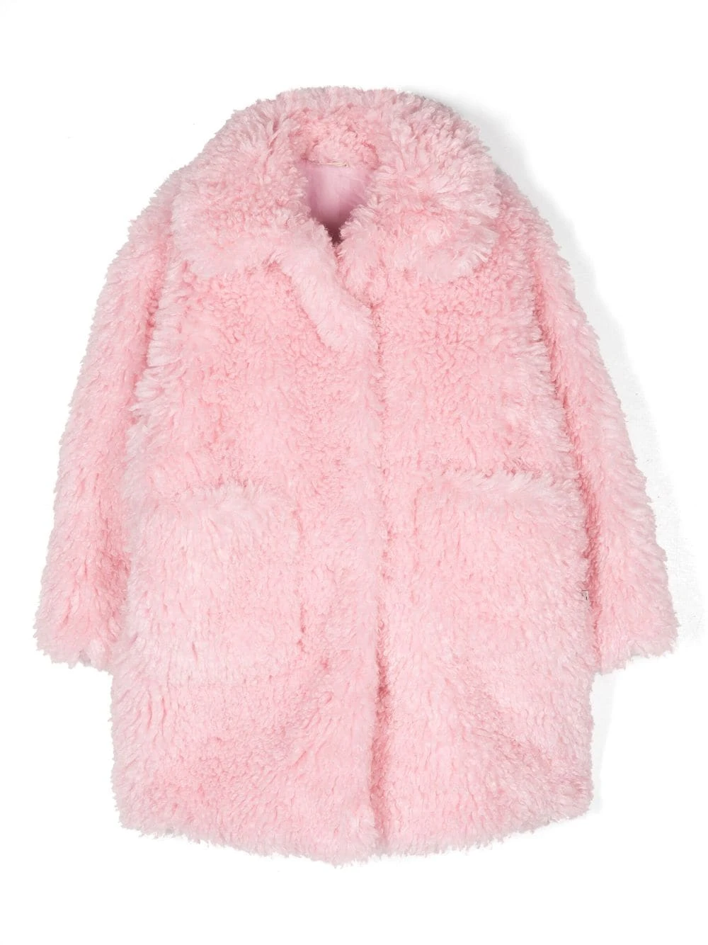 Tyggegummi-lyserød, imiteret lammeskindsdesign, krave med hak, skjult lukning foran, lange ærmer, to påsyede lommer foran, lige søm.