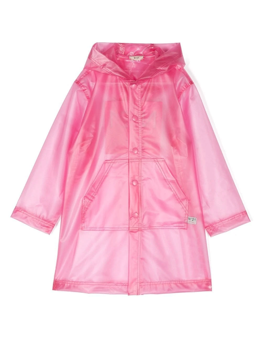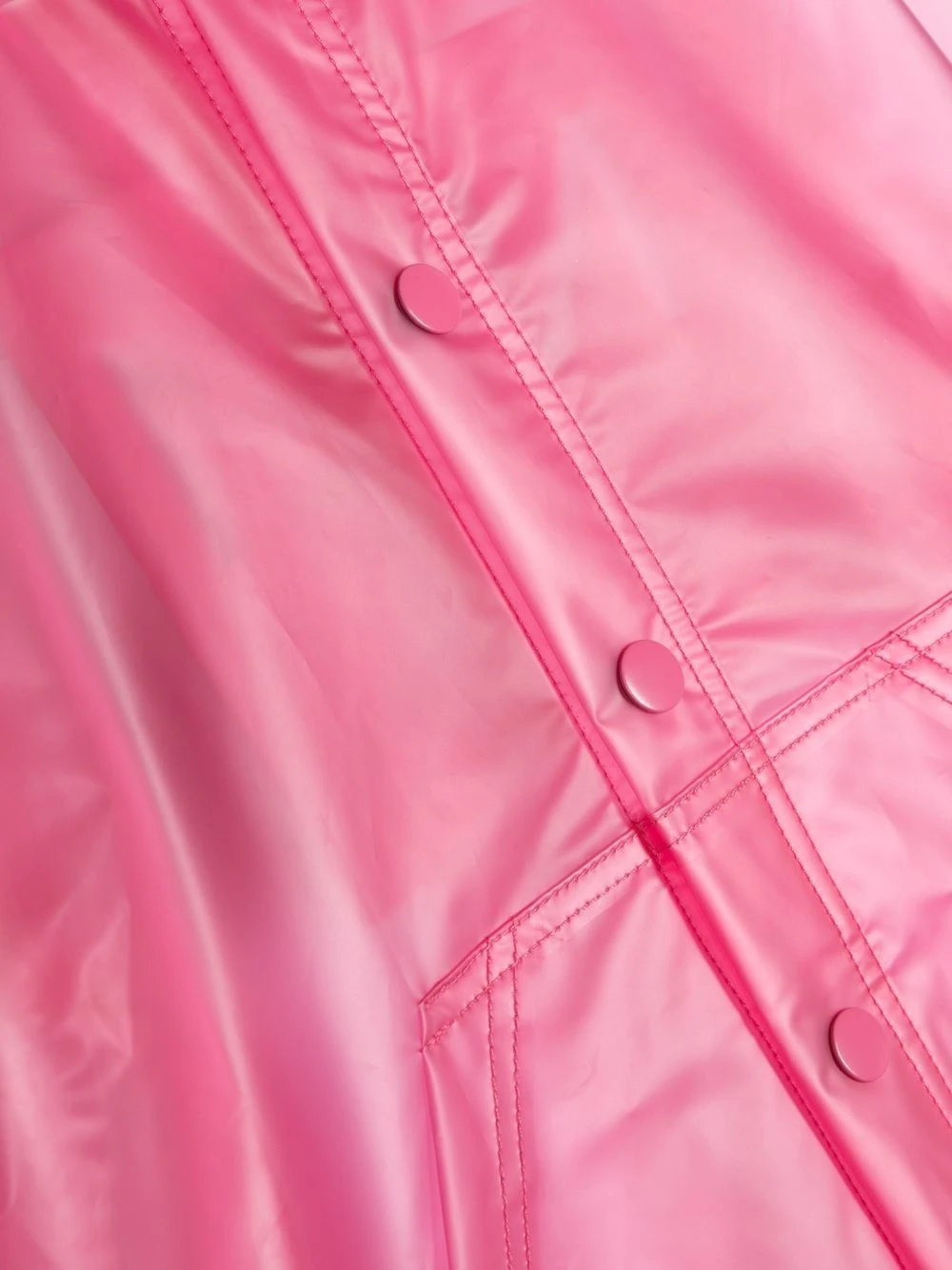 Pink, gennemsigtigt design, logotryk bagpå, slogantryk bagpå, lille logomærke, trykknaplukning foran, to punglommer foran, lange ærmer, lige søm.