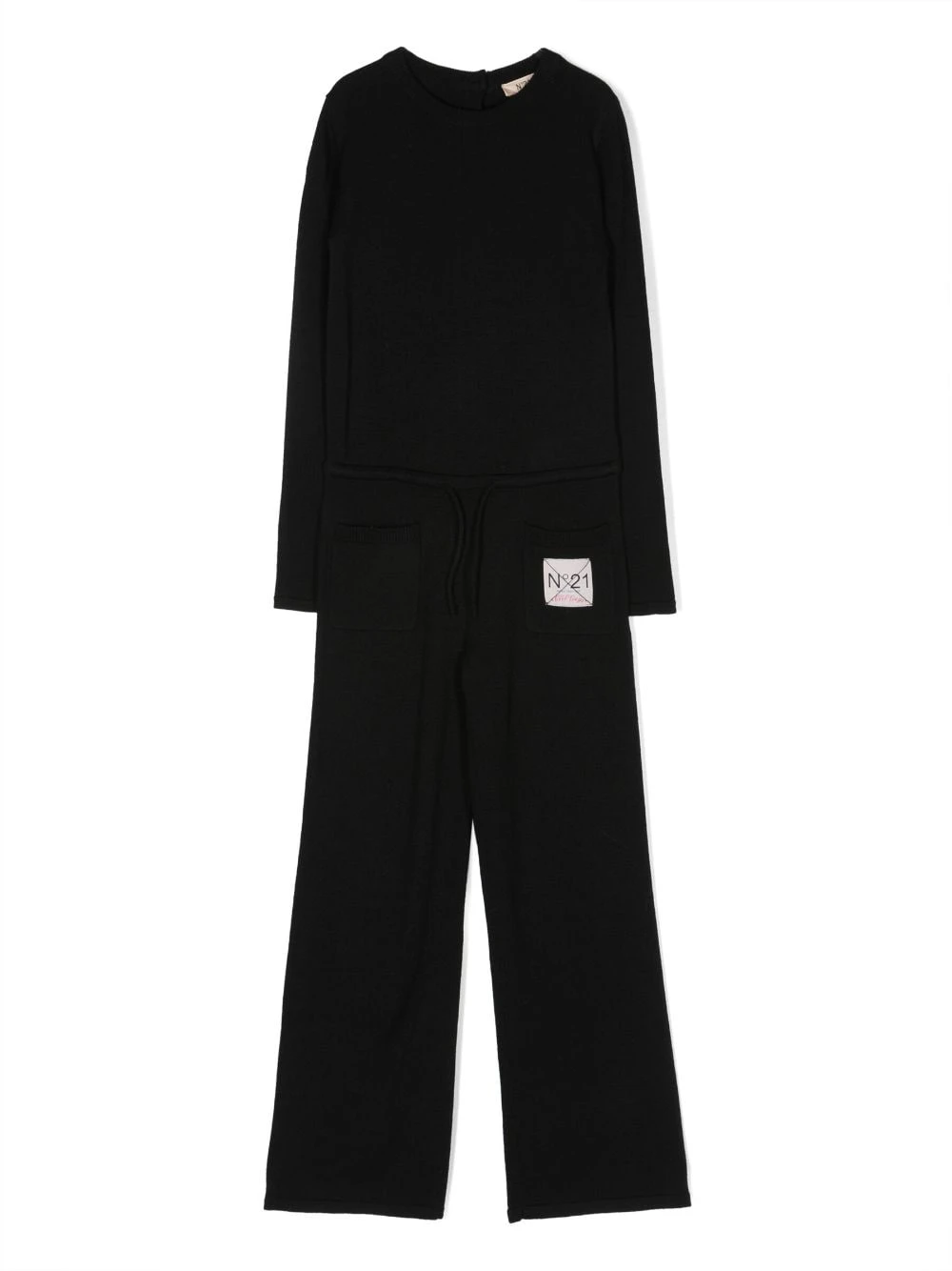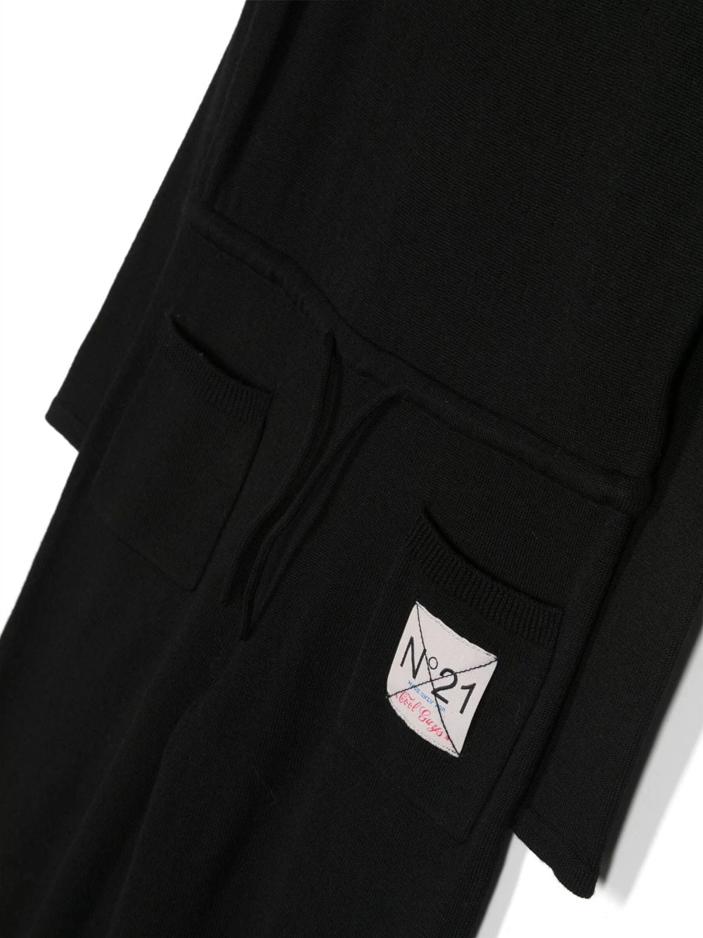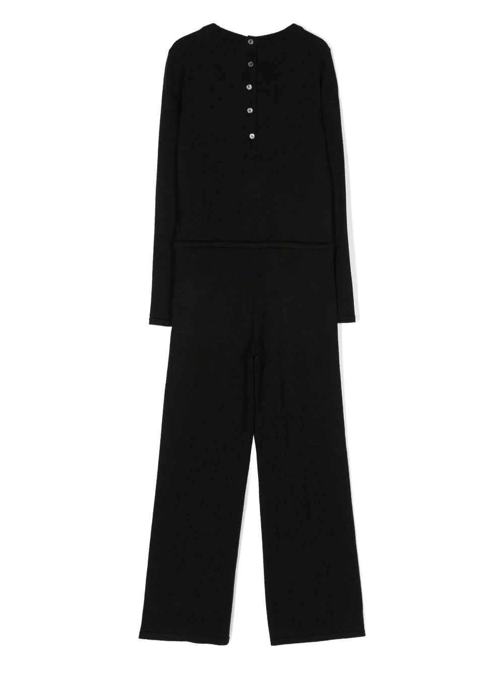 Sort, uldblanding, strikket konstruktion, logomærke foran, rund hals, talje med løbesnor, lange ærmer, knaplukning bagpå, lige ben, to påsyede lommer foran.