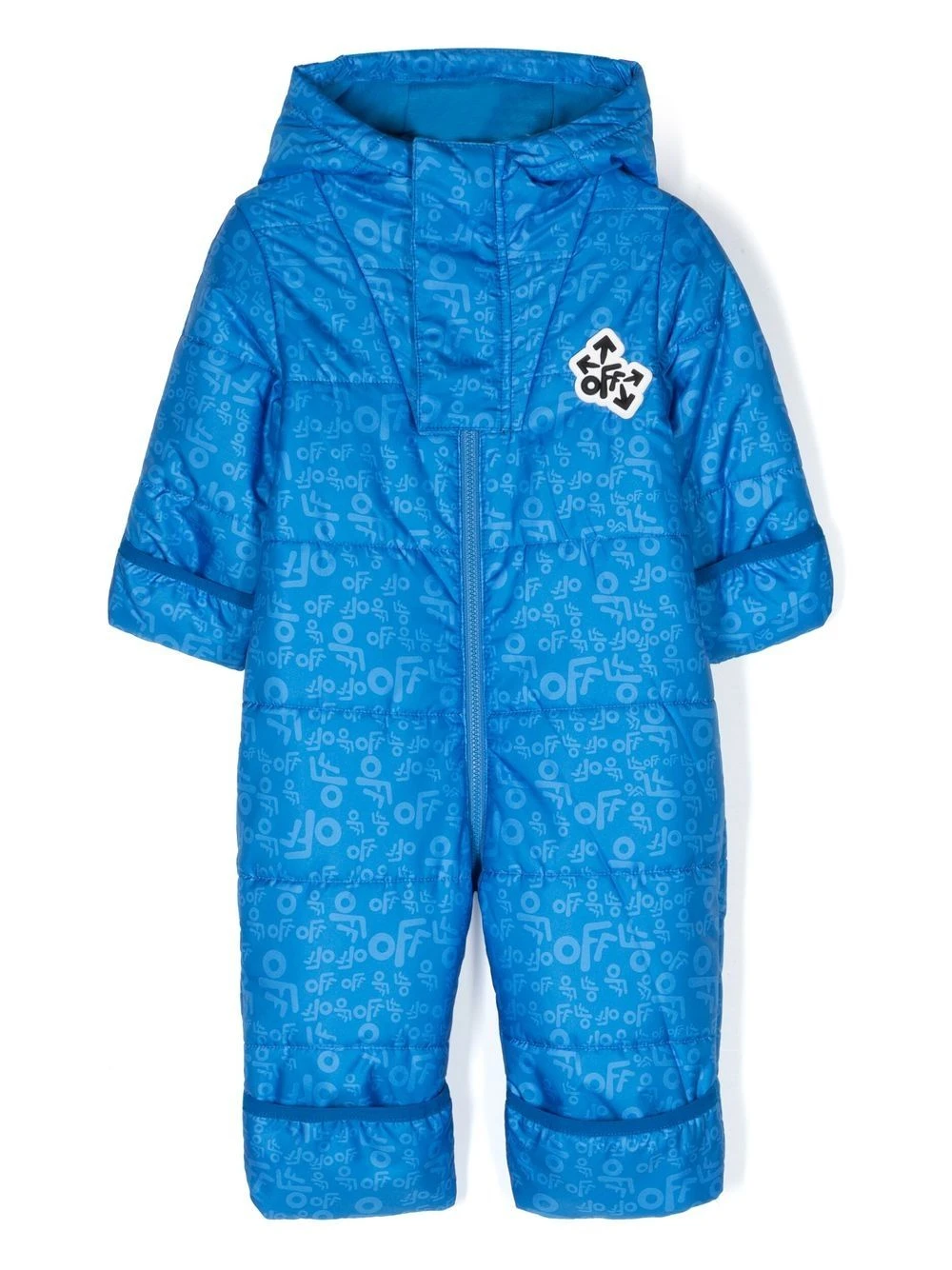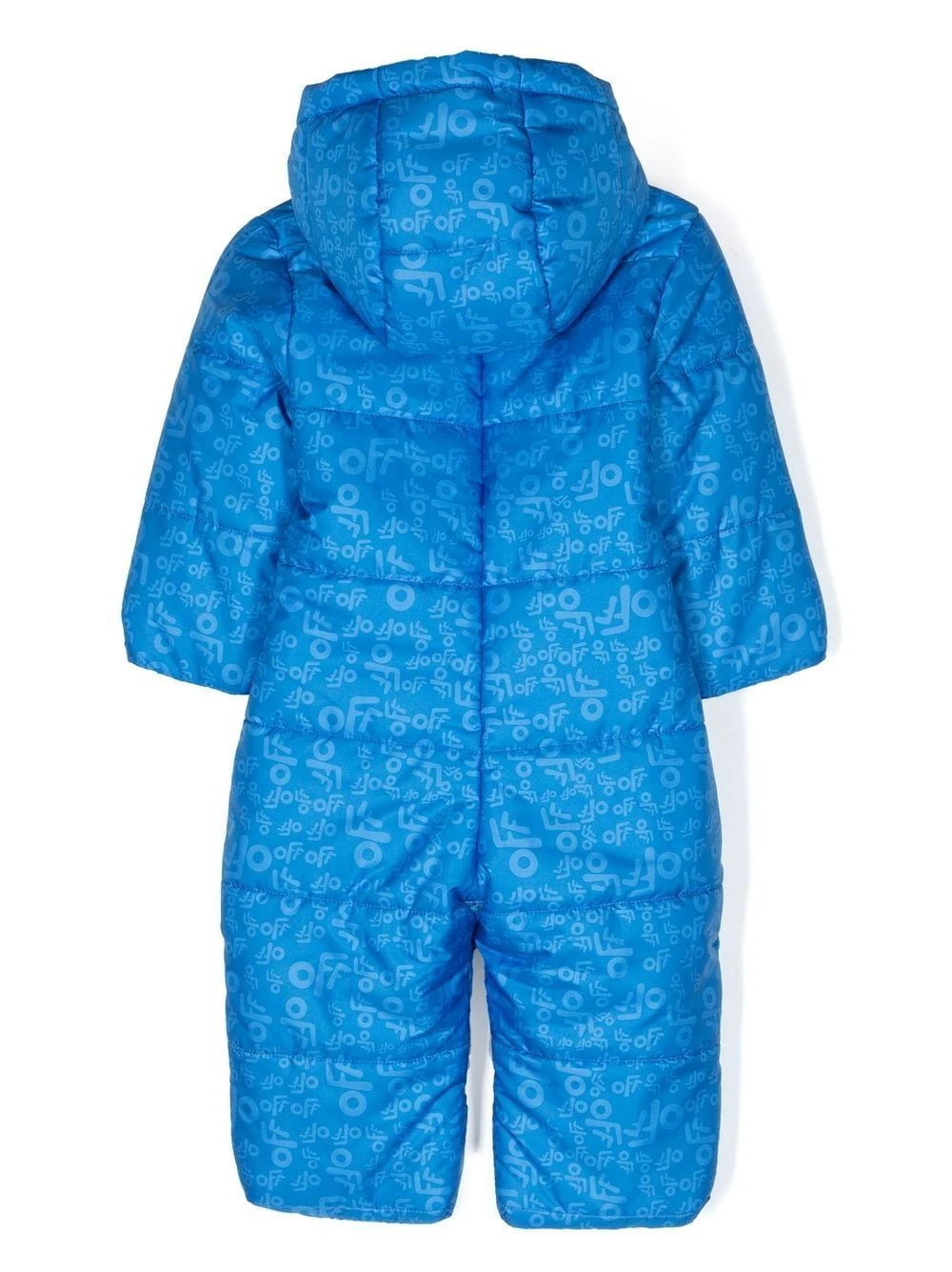 Blå, bomuld, polstret design, trøje med heldækkende logotryk, logomærke på brystet, klassisk hætte, høj hals, lange ærmer, lige ben.