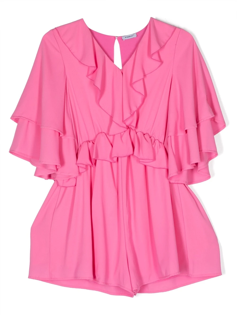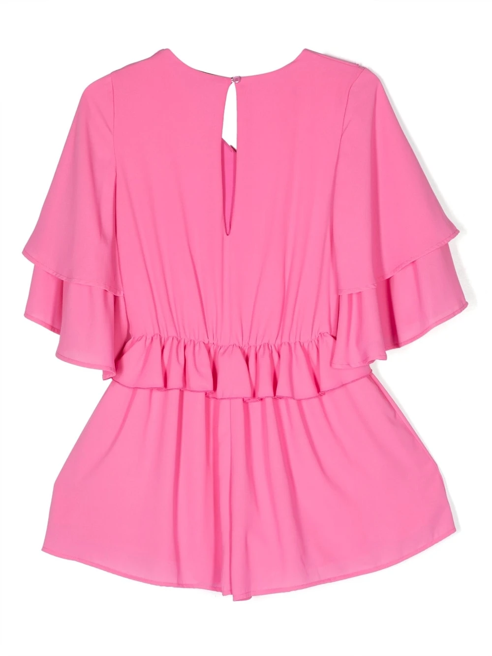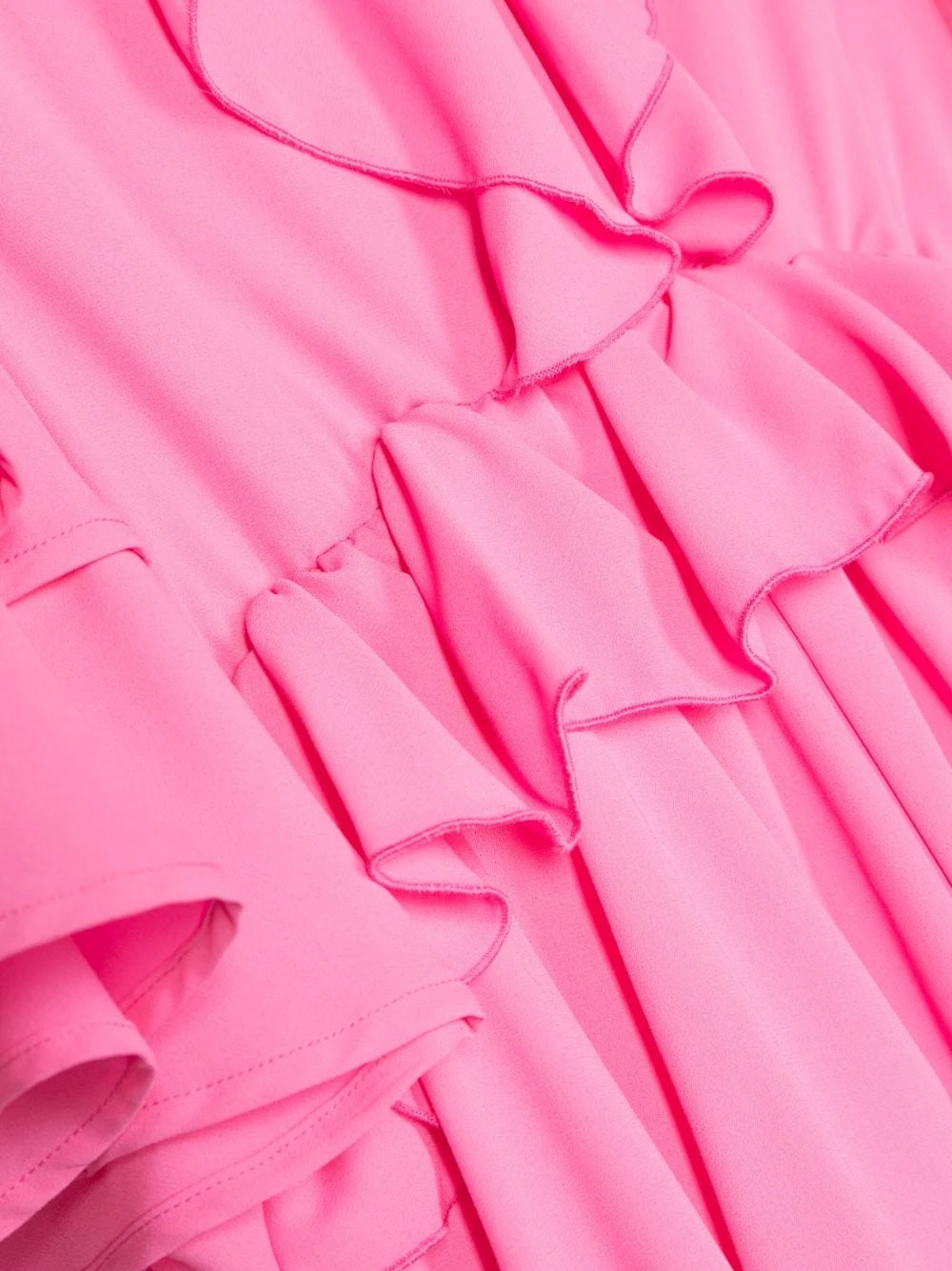 Tyggegummi-lyserød, flæsedetalje, faconsyet talje, V-hals, knaplukning bagpå, korte ærmer, lårkort.