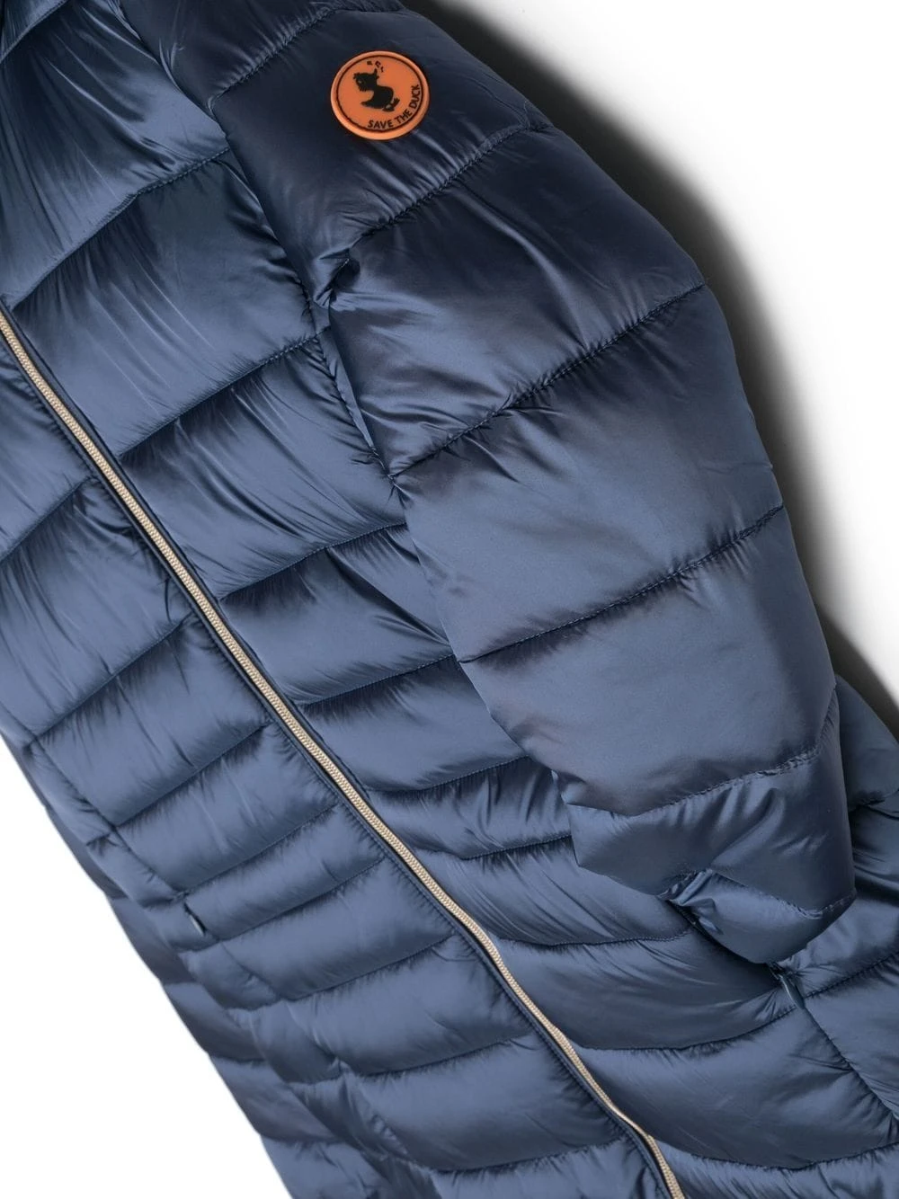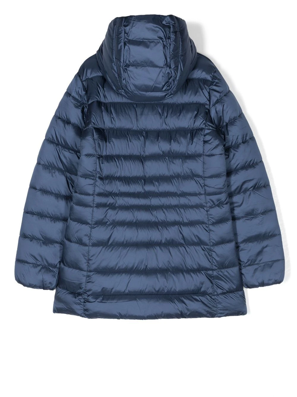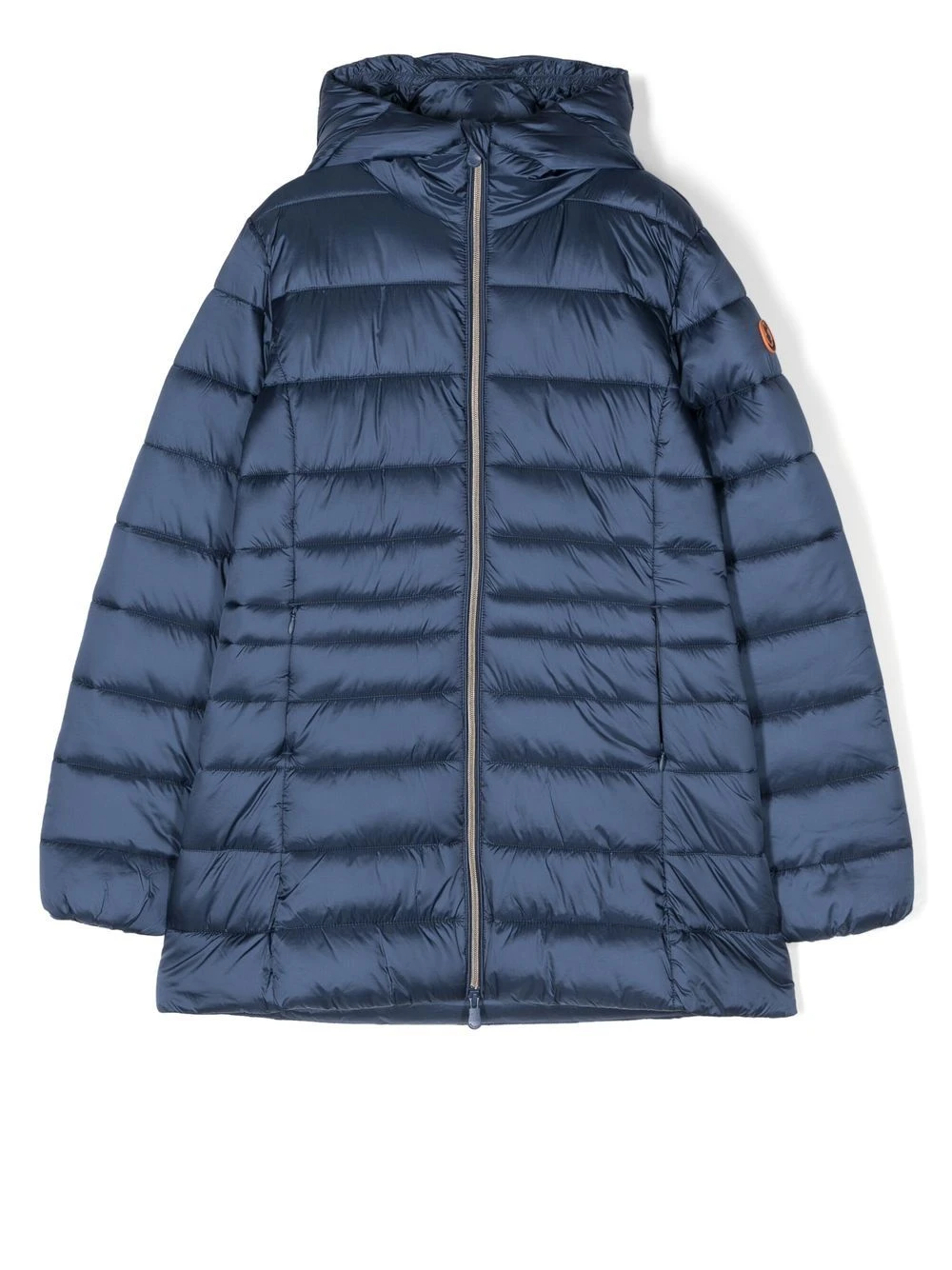 Blå, polstret design, logomærke på ærmet, klassisk hætte, høj hals, lynlåslukning foran, lange ærmer, lige søm, lynlåslommer foran.