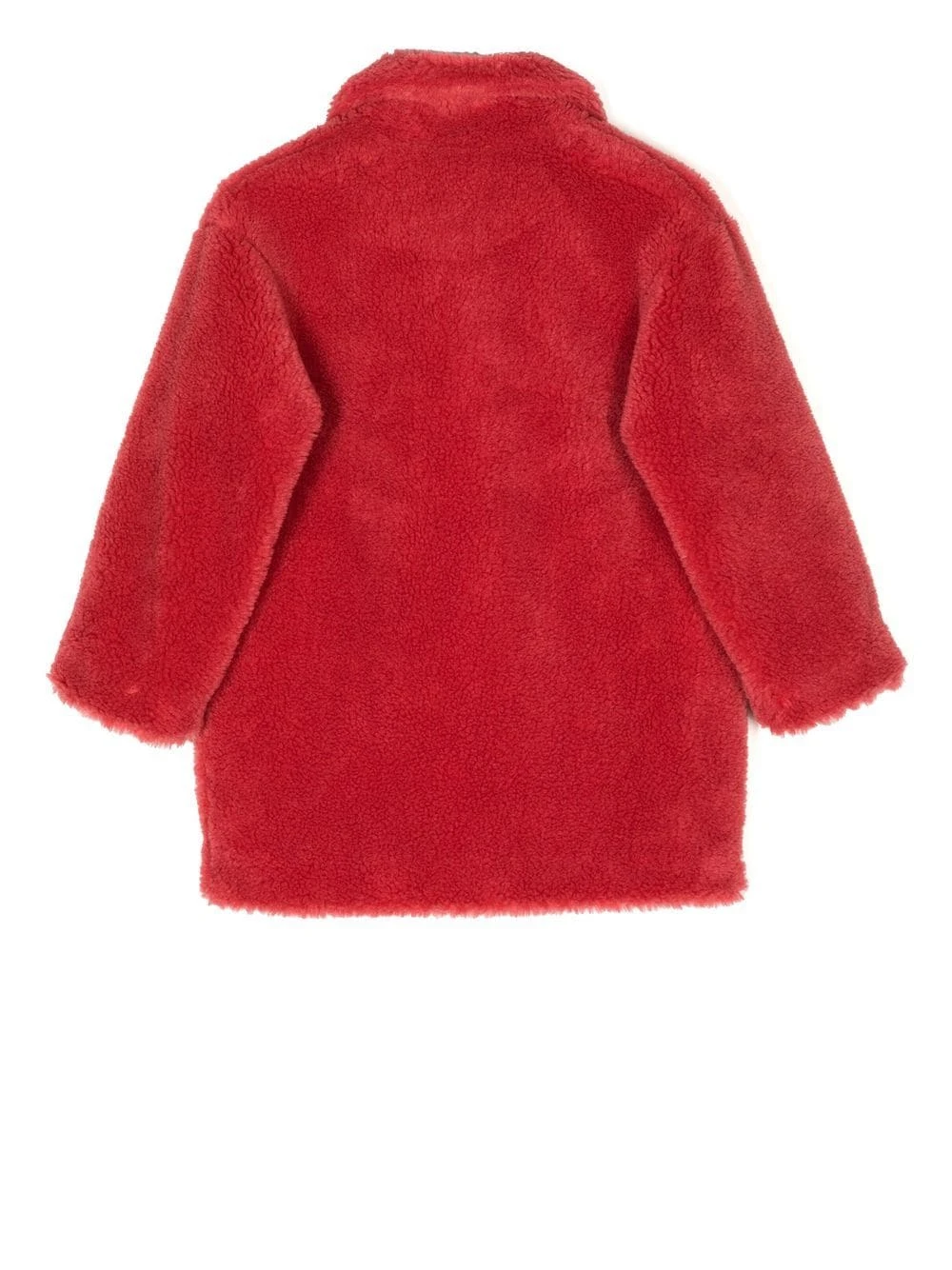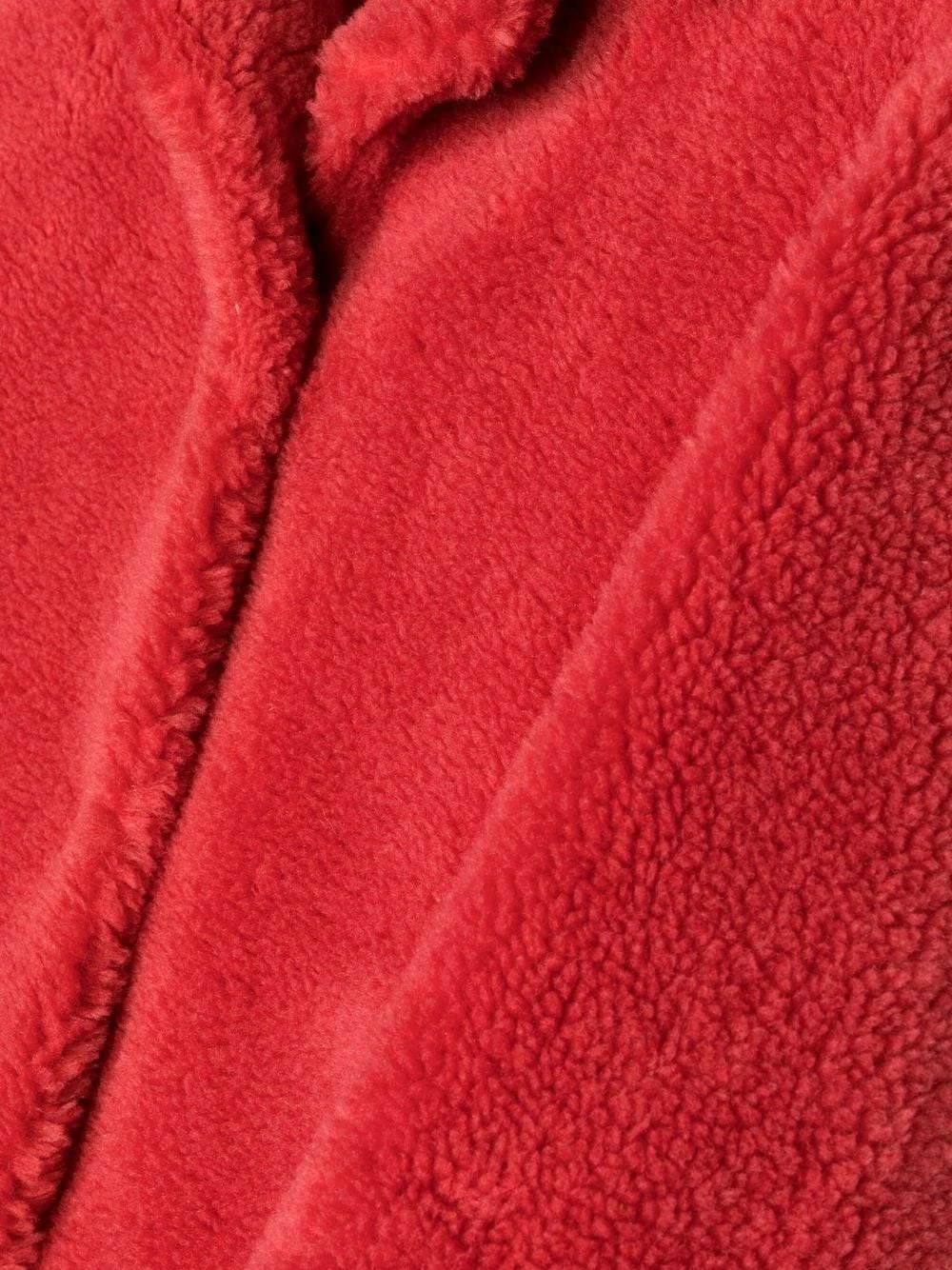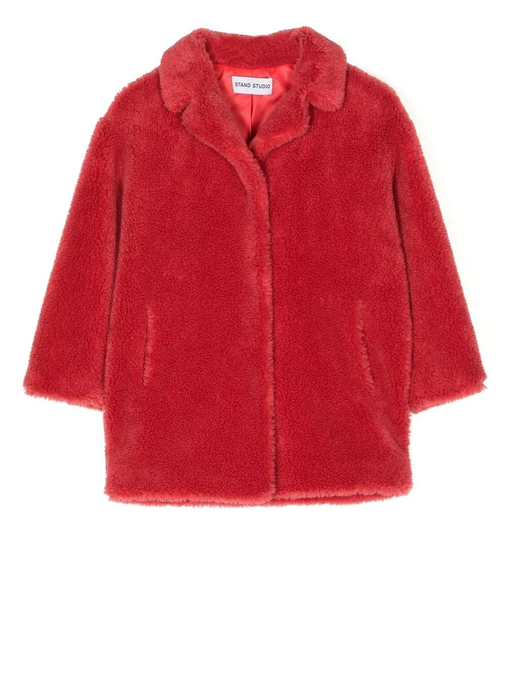 Imiteret lammeskind, klassiske reverser, knaplukning foran, lange ærmer, to kantbåndslommer foran.