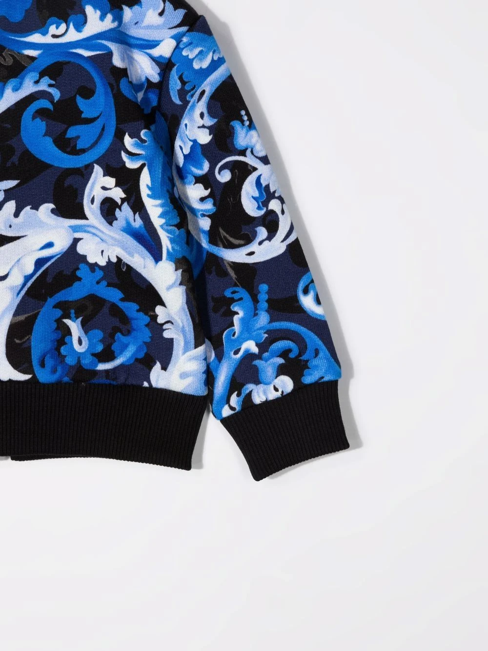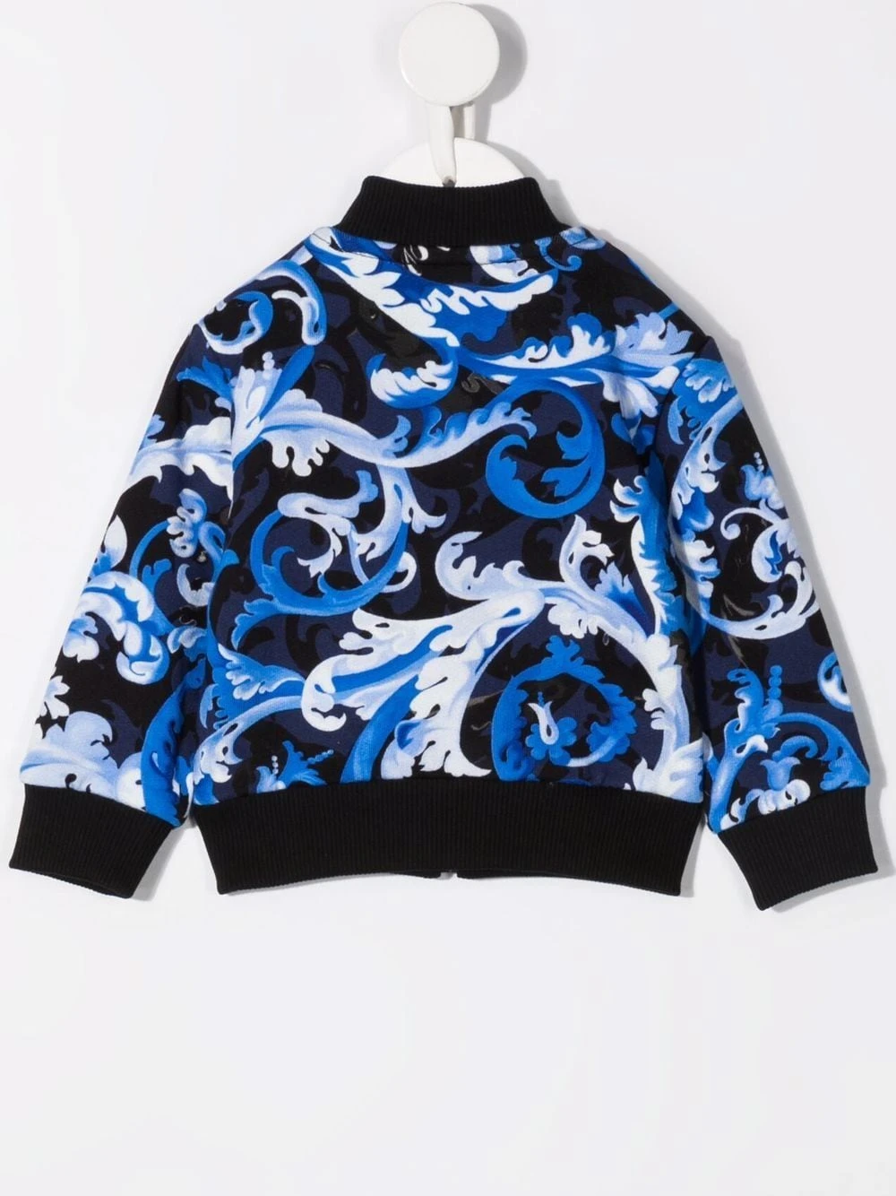 Barokmønster, ribbet båndkrave, lynlåslukning foran, lange ærmer, ribbet kant.