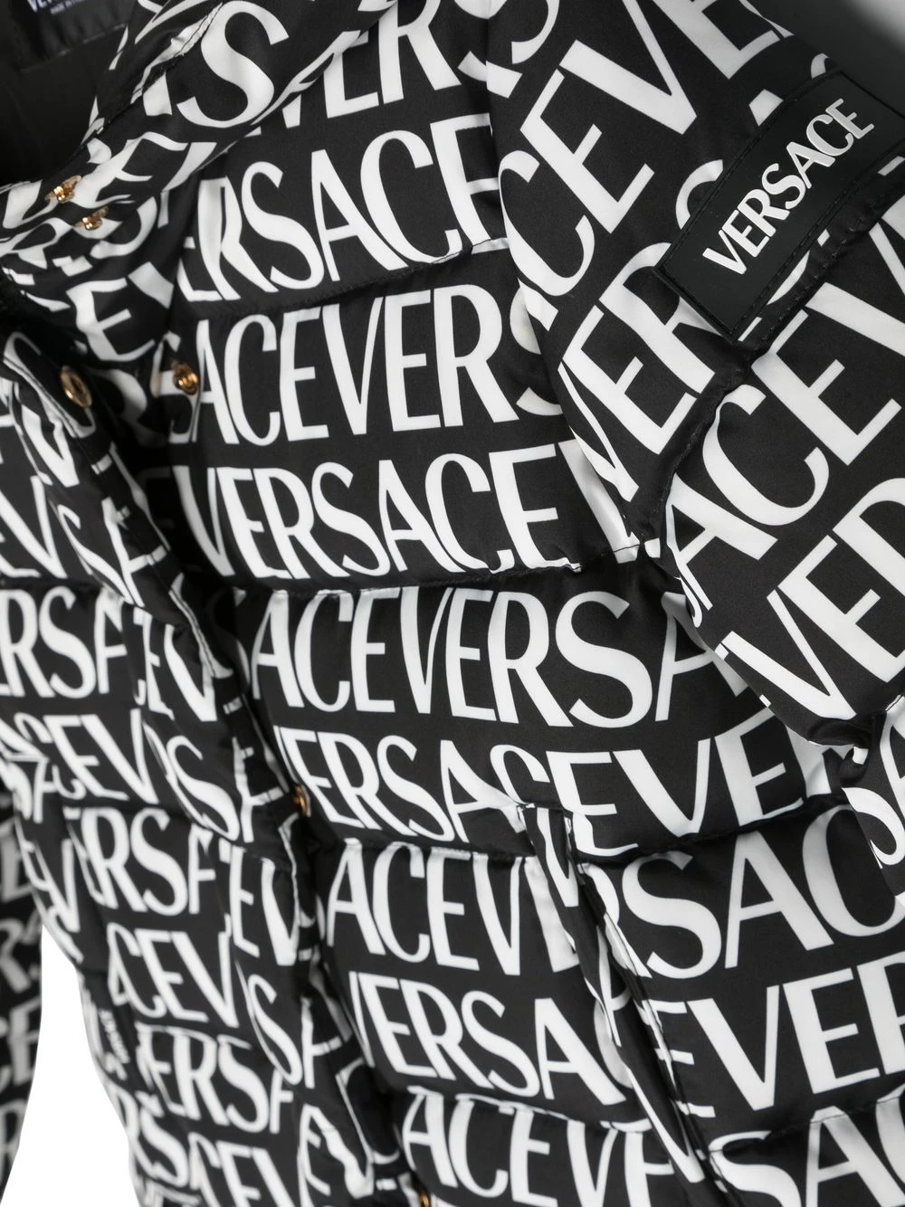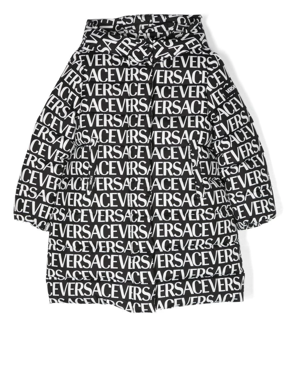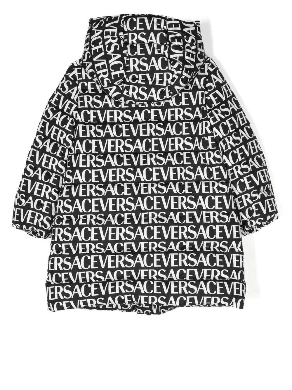 Sort/hvid, gåsedun, trøje med heldækkende logotryk, klassisk hætte, skjult lukning foran, lange ærmer, to stiklommer i siden.