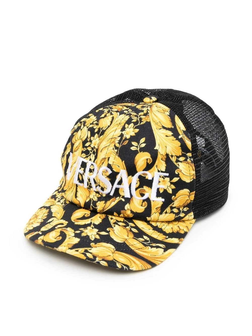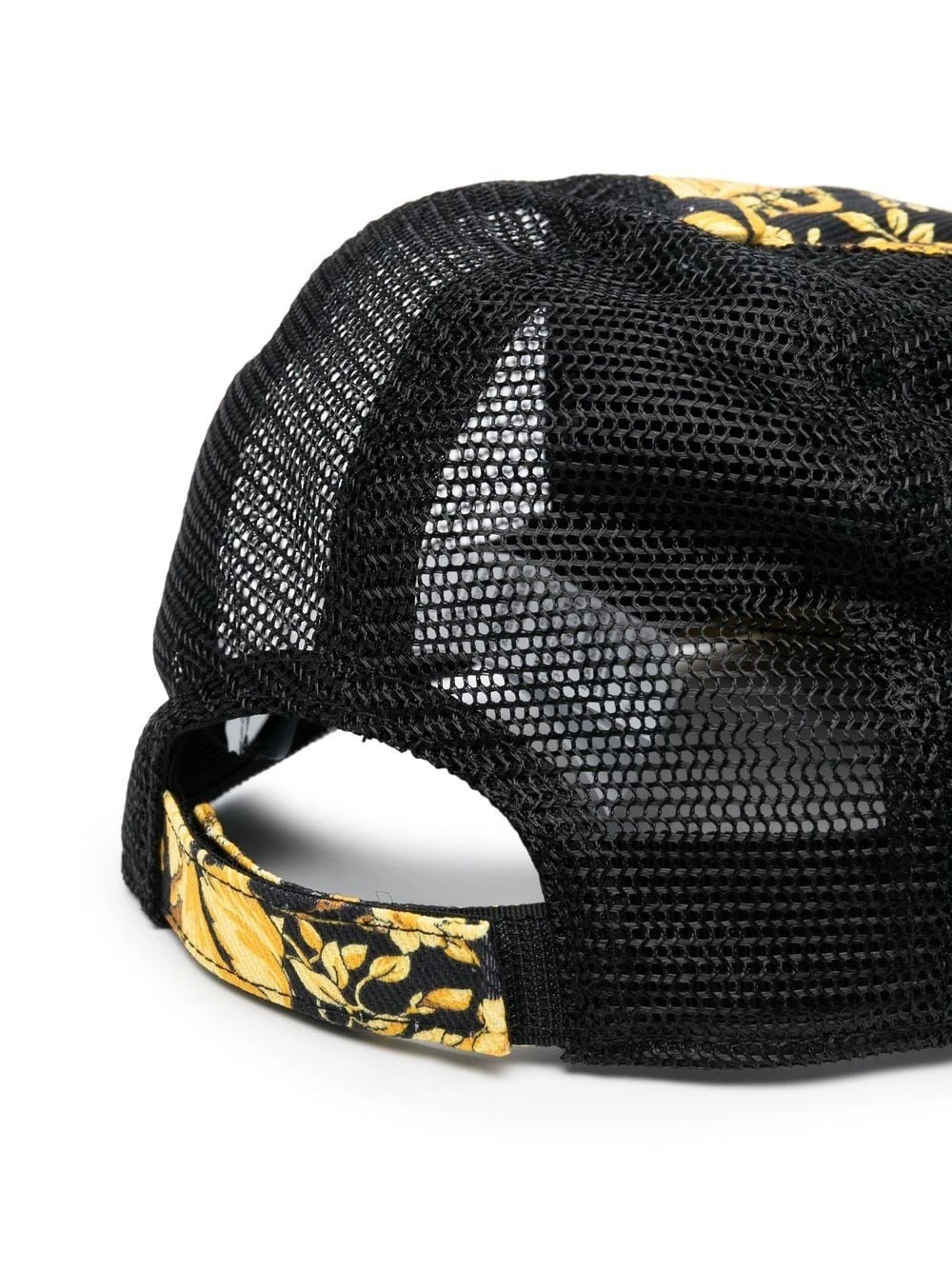 Sort, bomuldsblanding, barokmønster, logotryk foran, mesh-detaljer, flad skygge.