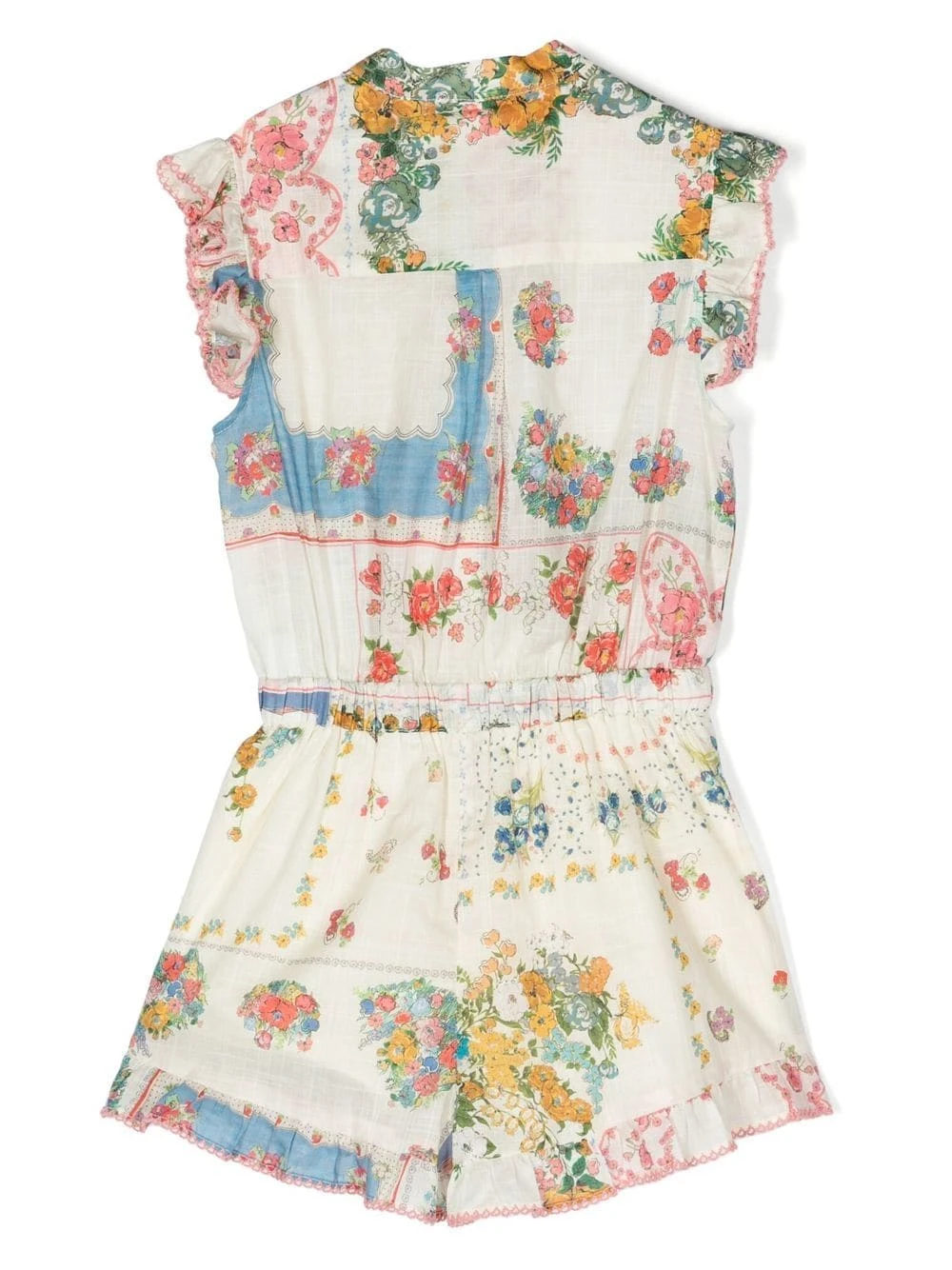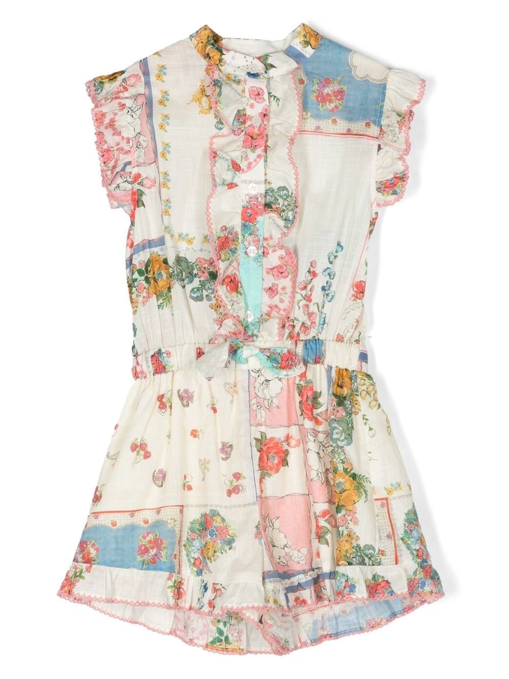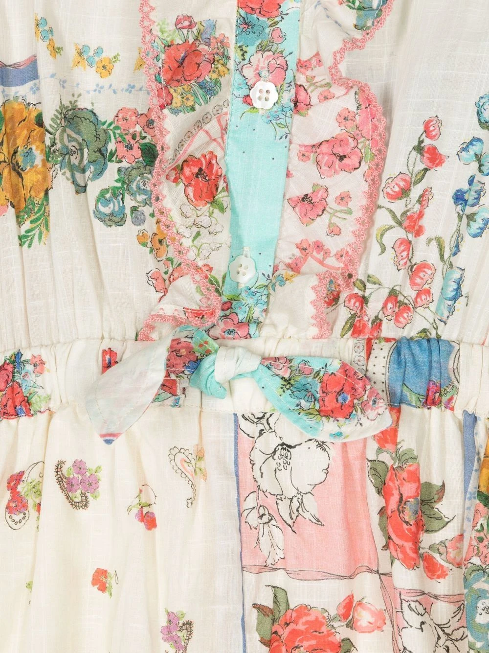 Flerfarvet, bomuld, patchwork-design, flæsedetalje, knaplukning foran, rund hals, elastikkant, lige ben.